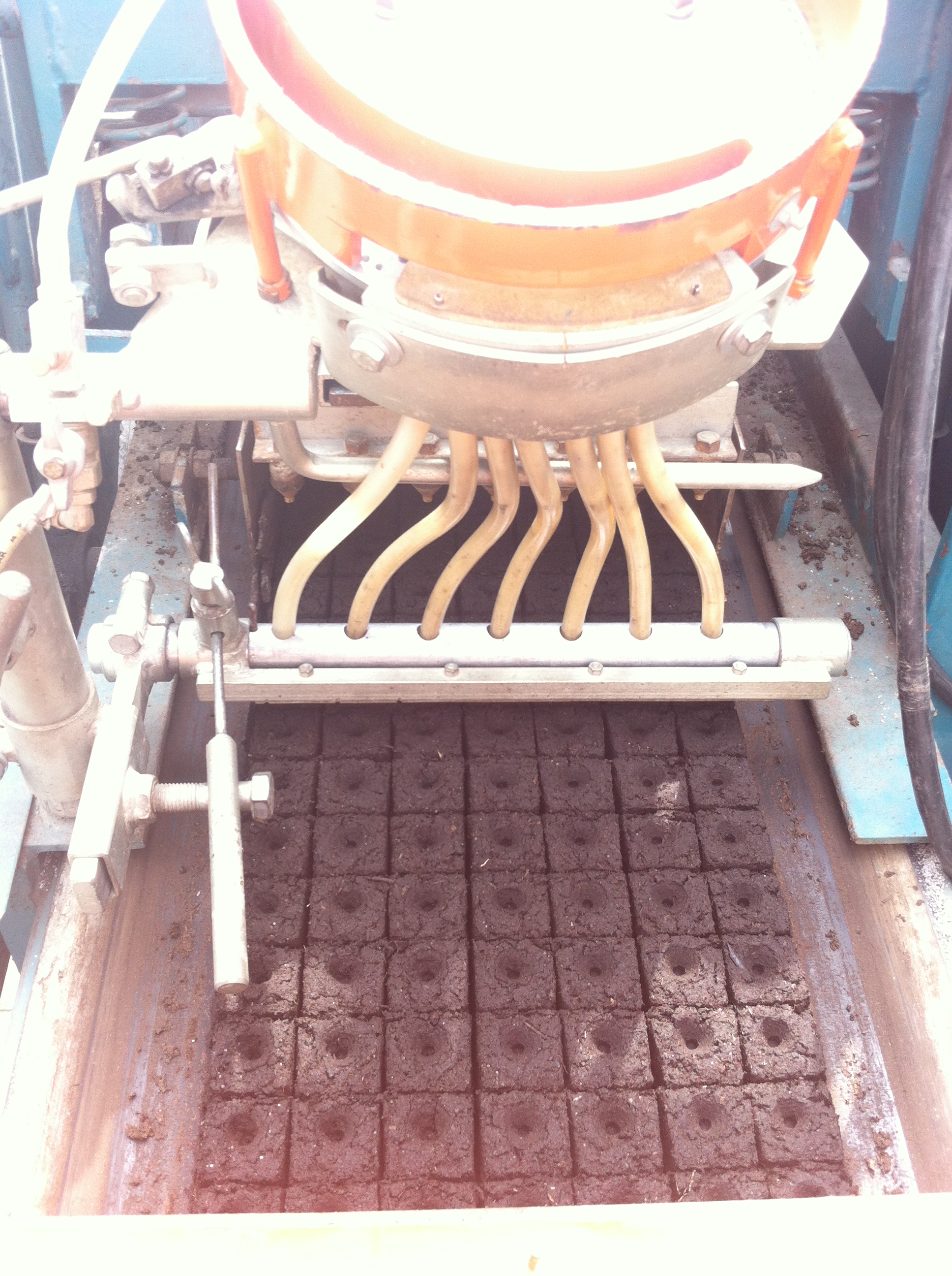 Dann darf ich einen Blick auf die Pflanzmaschine werfen: Ein Metalltrichter wird mit Erde befüllt, die in Kästen fällt, dort angedrückt und viereckig eingestanzt wird. Weiter gehts mit einem Loch, das in die Mitte der gestanzten Vierecke gemacht wird und der Reihe Schläuche, aus denen der Same direkt im Loch platziert wird. Fertig. Auch wenn ich es nicht so gut beschreiben kann, klar wird bestimmt, dass die Gärtnerromantik da flöten geht.