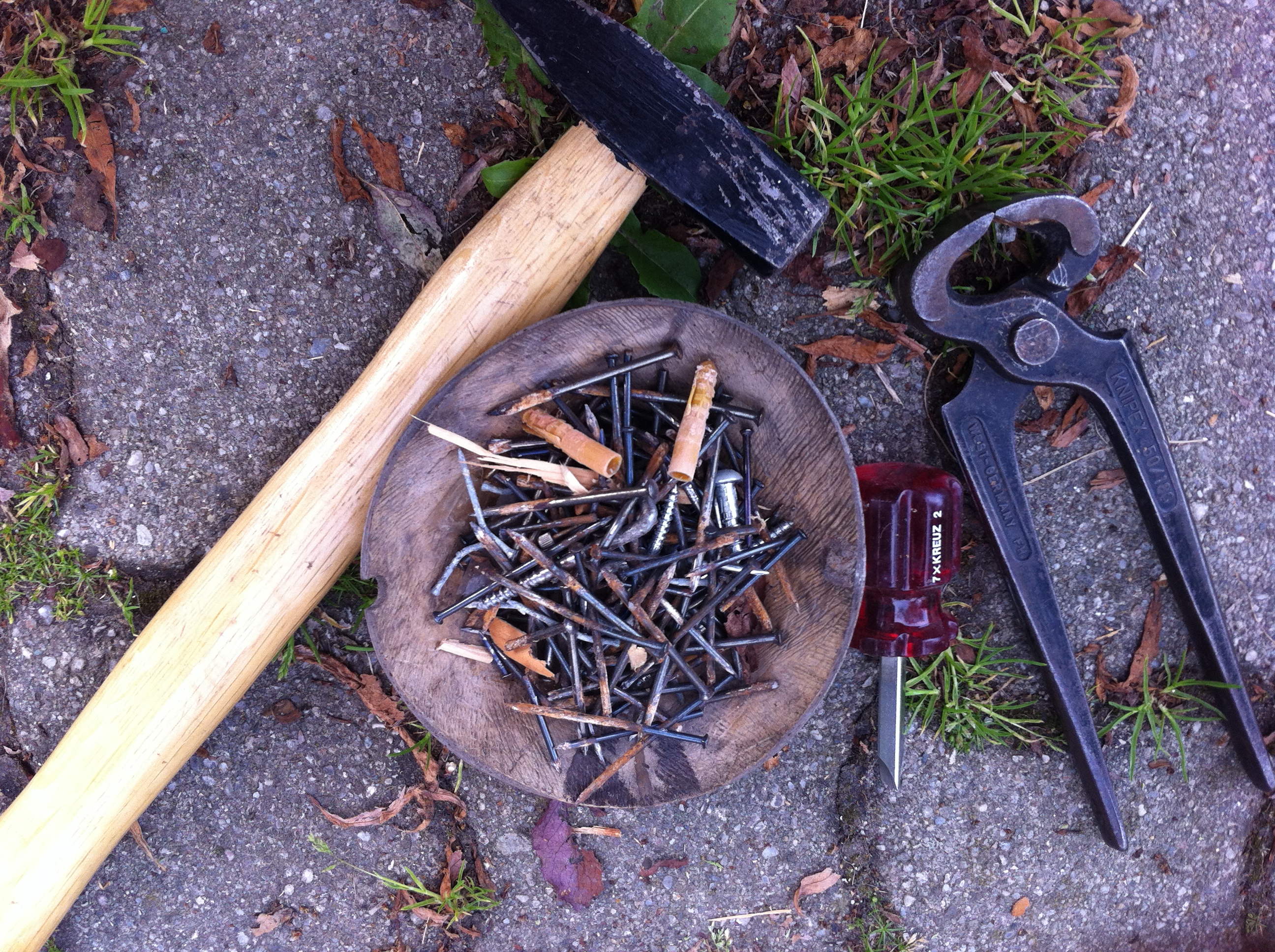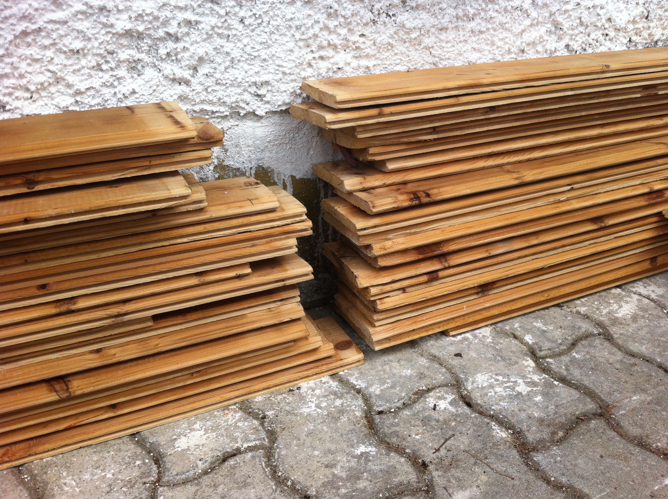 Das Holz muss von alten Schrauben, Dübeln und Nägeln befreit werden, das dauert schon mal zwei Stunden.