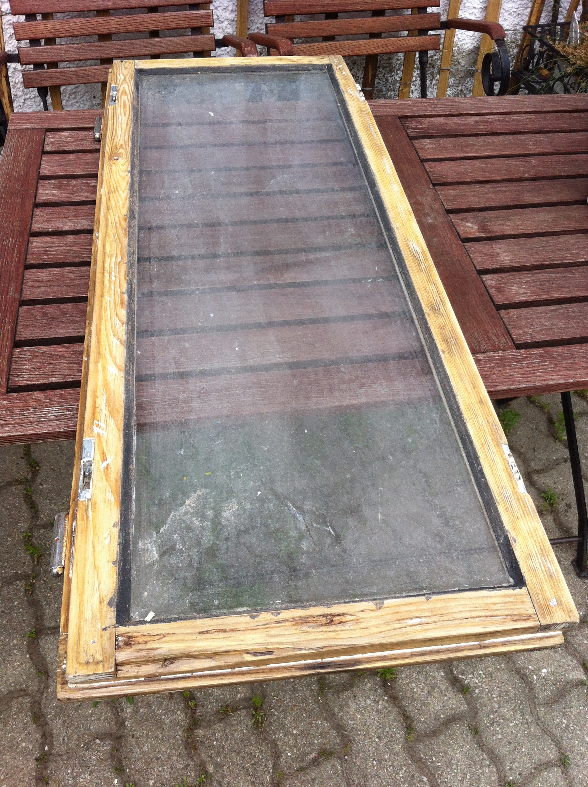Als erstes brauchen wir Holz und ein altes Fenster. Beides finden wir für geschenkt im Internet mit Abholung bei uns in der Nähe. Das Holz ist von einer alten Küchenverkleidung, das Fenster von einem abbruchreifen Schrebergarten-Häuschen: