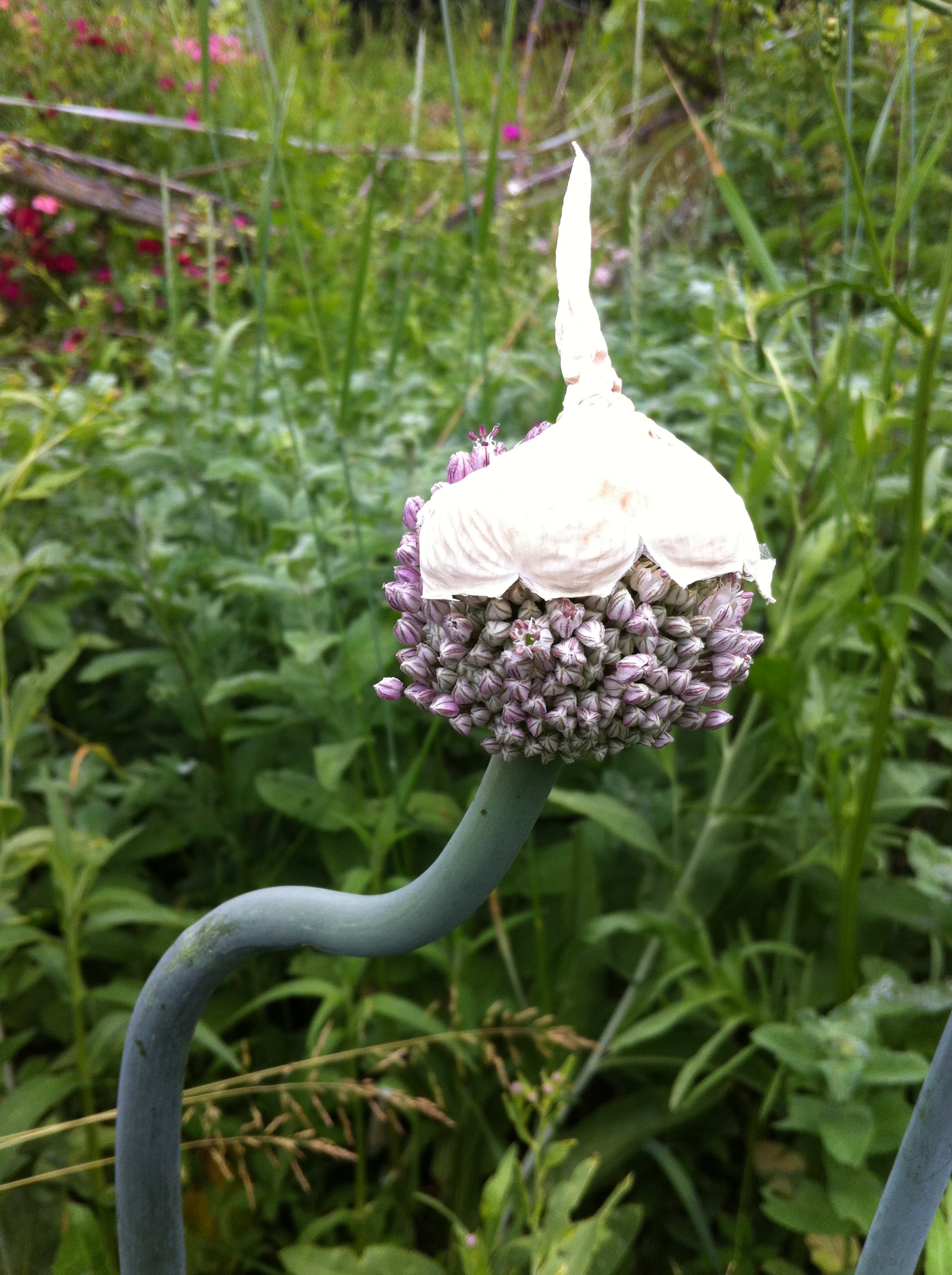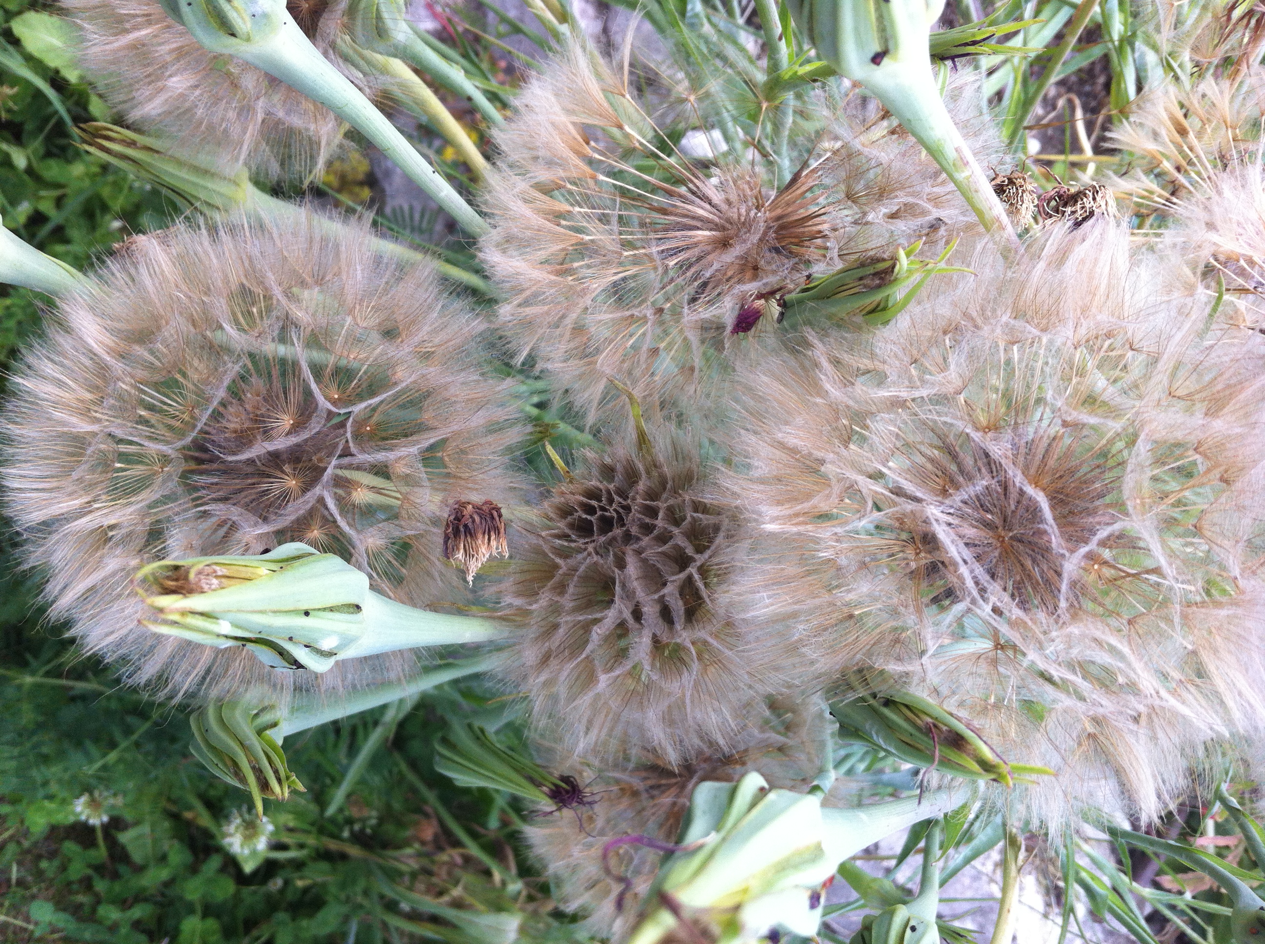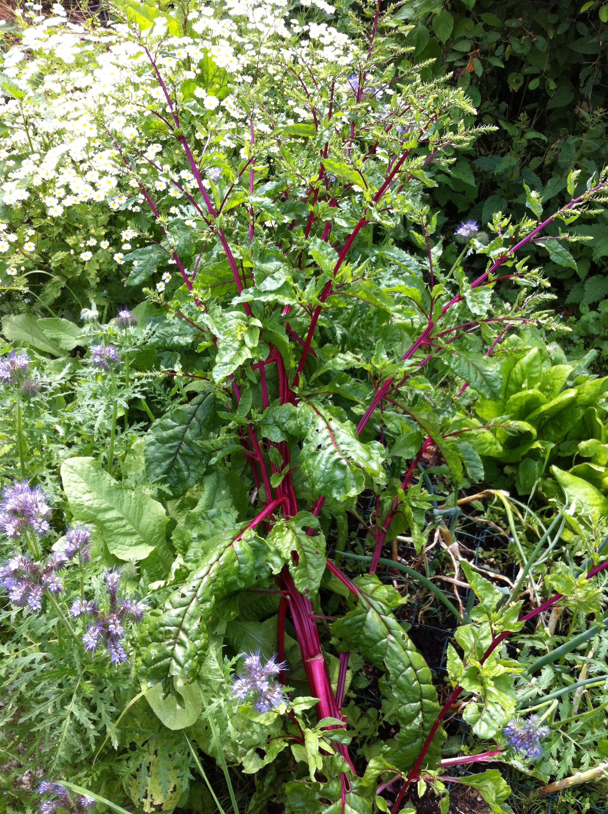 Ich entdecke auf unserem Rundgang durch den Waldgarten eine wunderbare Staude mit lila Sonnenblüten, langen Stängeln und faustgroßen Pusteblumen-Kugeln. Was, das ist die Haferwurz? Bei mir zu Hause zeigt die nur zwei mickrige, längliche Blätter. Achso, im zweiten Jahr sieht die erst so aus, wenn sie die Samen ausbildet. Ahja. Und was ist das für ein Busch? Ein Mangold? Ah, auch im zweiten Jahr, so so. Eigentlich krass, dass ich keine Gemüsepflanze kenne, wie sie im zweiten Jahr aussieht.