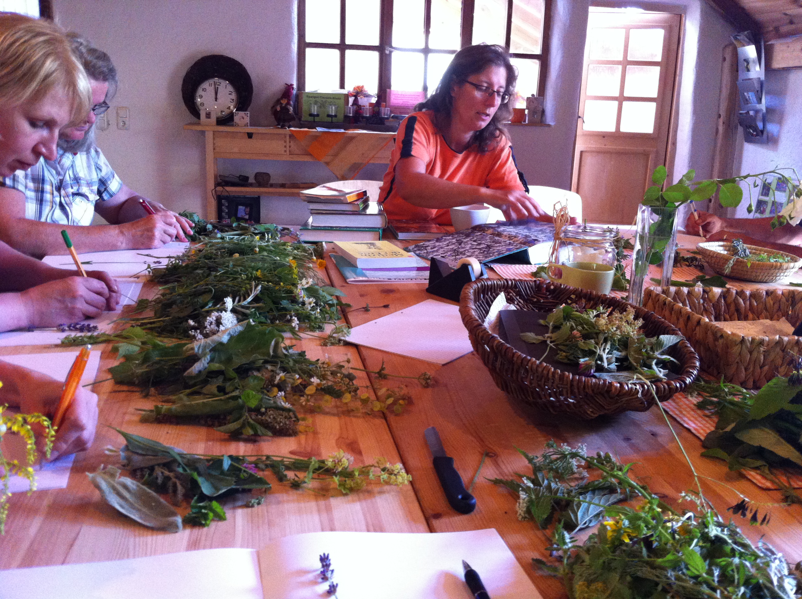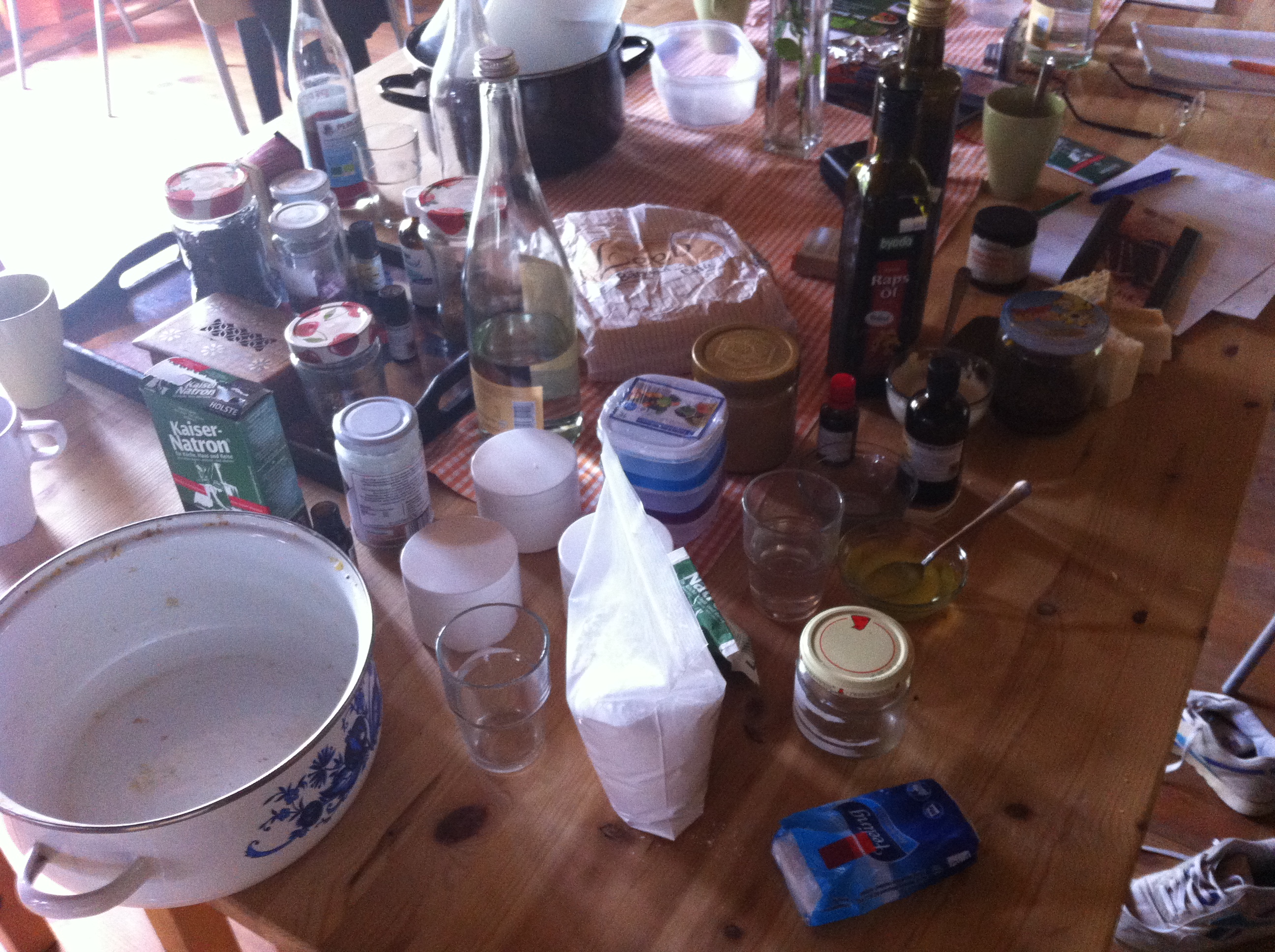 Was die Oma vielleicht noch kannte und ich mir kaum vorstellen kann: Ein plastikfreies Badezimmer mit selbstgemachten Wasch- und Putzutensilien. Ob das funktioniert, die Schlämmkreide-Zahncreme mit Fenchelöl, die Ringelblumencreme mit Bienenwachs, die Haarseife und der Fichtennadel-Kloreiniger? Keine Ahnung, ich werde es ausprobieren, sobald ich zu Hause bin. Hier im Kurs sieht es schon mal interessant aus und irgendwie auch nach Hexenküche, so mit Natron und diversen Kräuterlein, Seifenformen und Ölen.