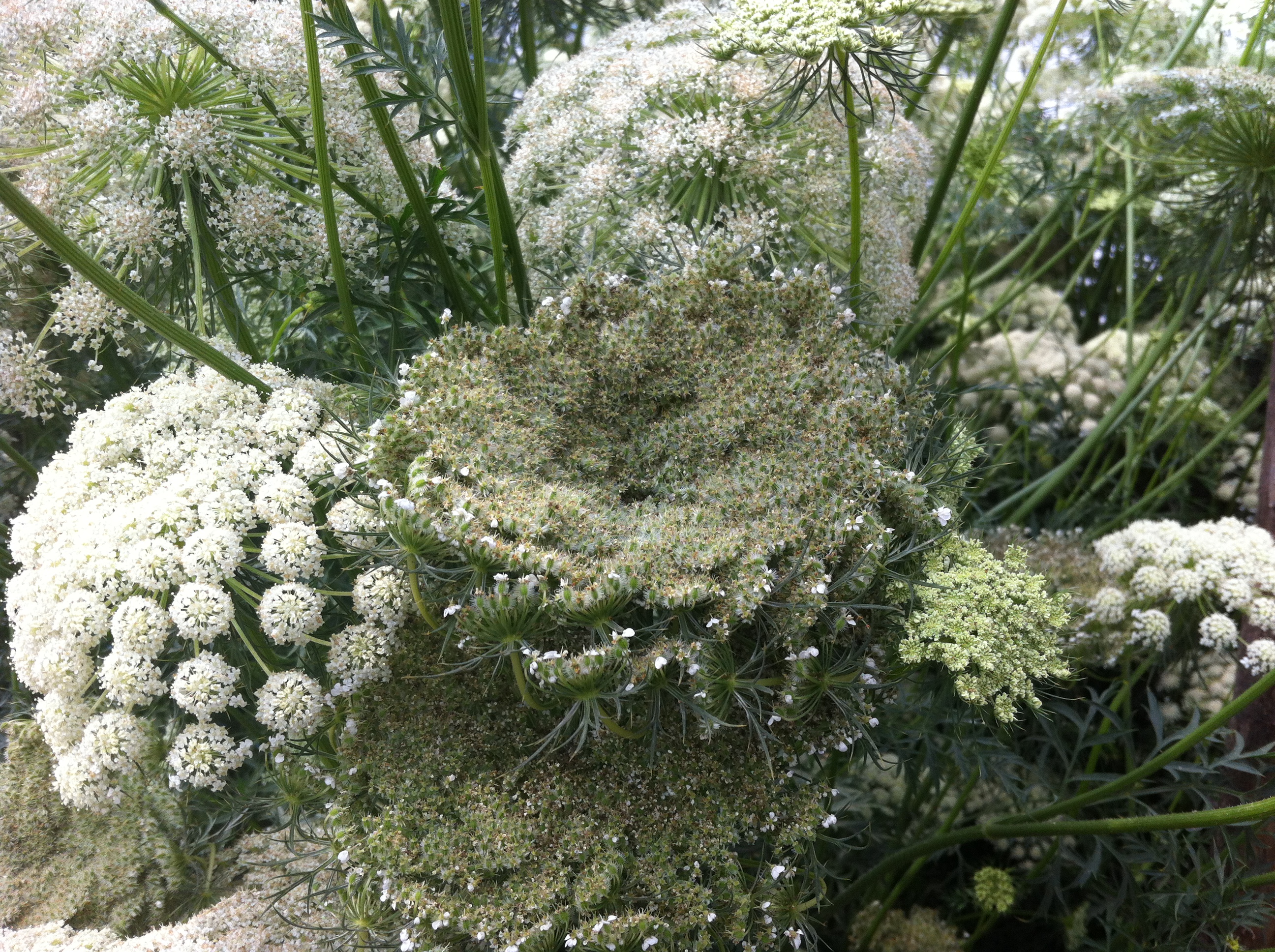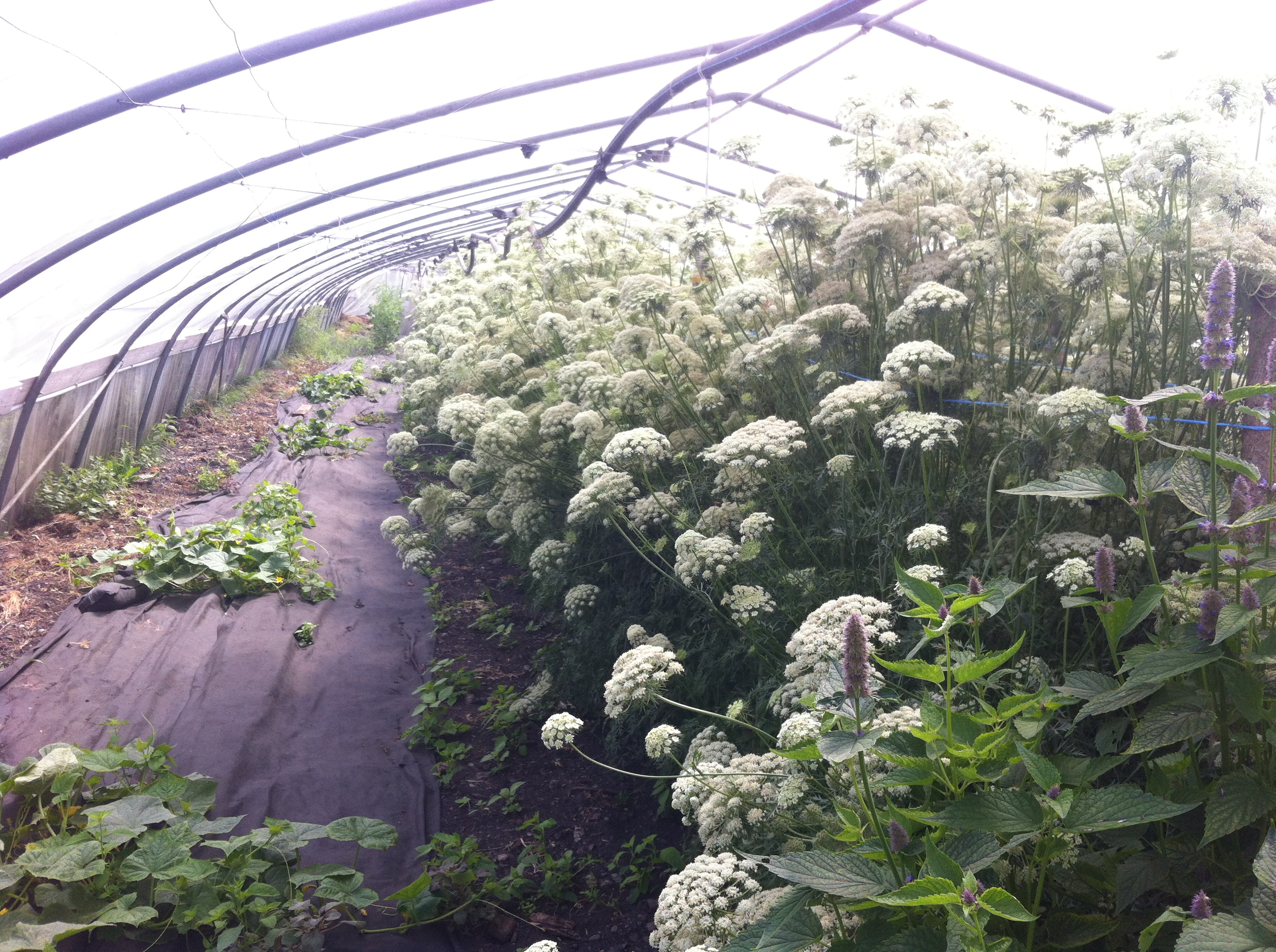 Der Eingang zum Gewächshaus ist mit einem Fliegenvorhang gesichert. Darin schwirren Fliegen und Hummeln zum Bestäuben herum – und die sollen nicht hinaus, sondern drinnen ihre Arbeit tun und die schönen Dolden der Möhrenblüten anfliegen. Die Möhre blüht erst im zweiten Jahr, d.h. es dauert vier Jahre bis zur zweiten Generation und an die zehn Jahre und mehr bis eine neue Sorte gezüchtet ist. Dann muss sie noch zugelassen werden – was auch ein kompliziertes Thema ist, da die Zulassungskriterien sich an F1-Hybriden orientieren und samenfeste Sorten nicht immer gleich lange Stengel oder gleich große Abstände zwischen den Blättern haben (und herjeh, wen interessiert das schon, wenn es schmeckt?).