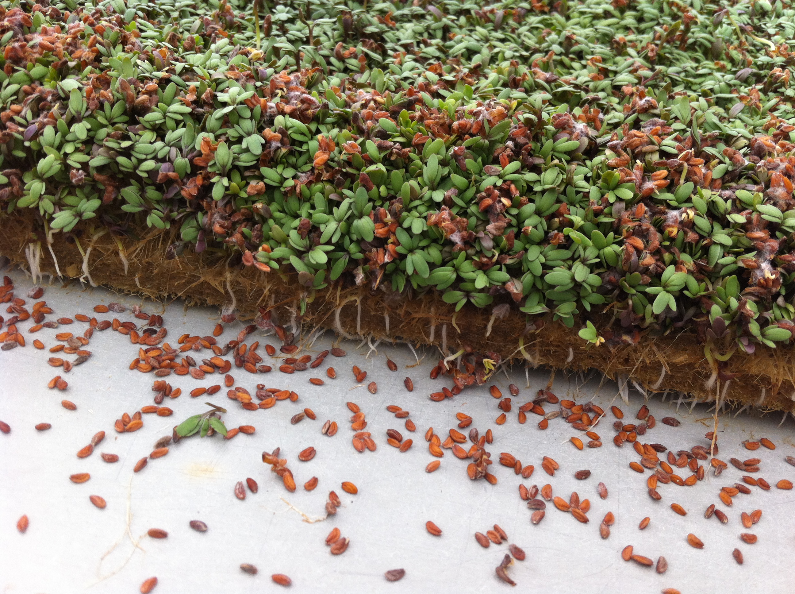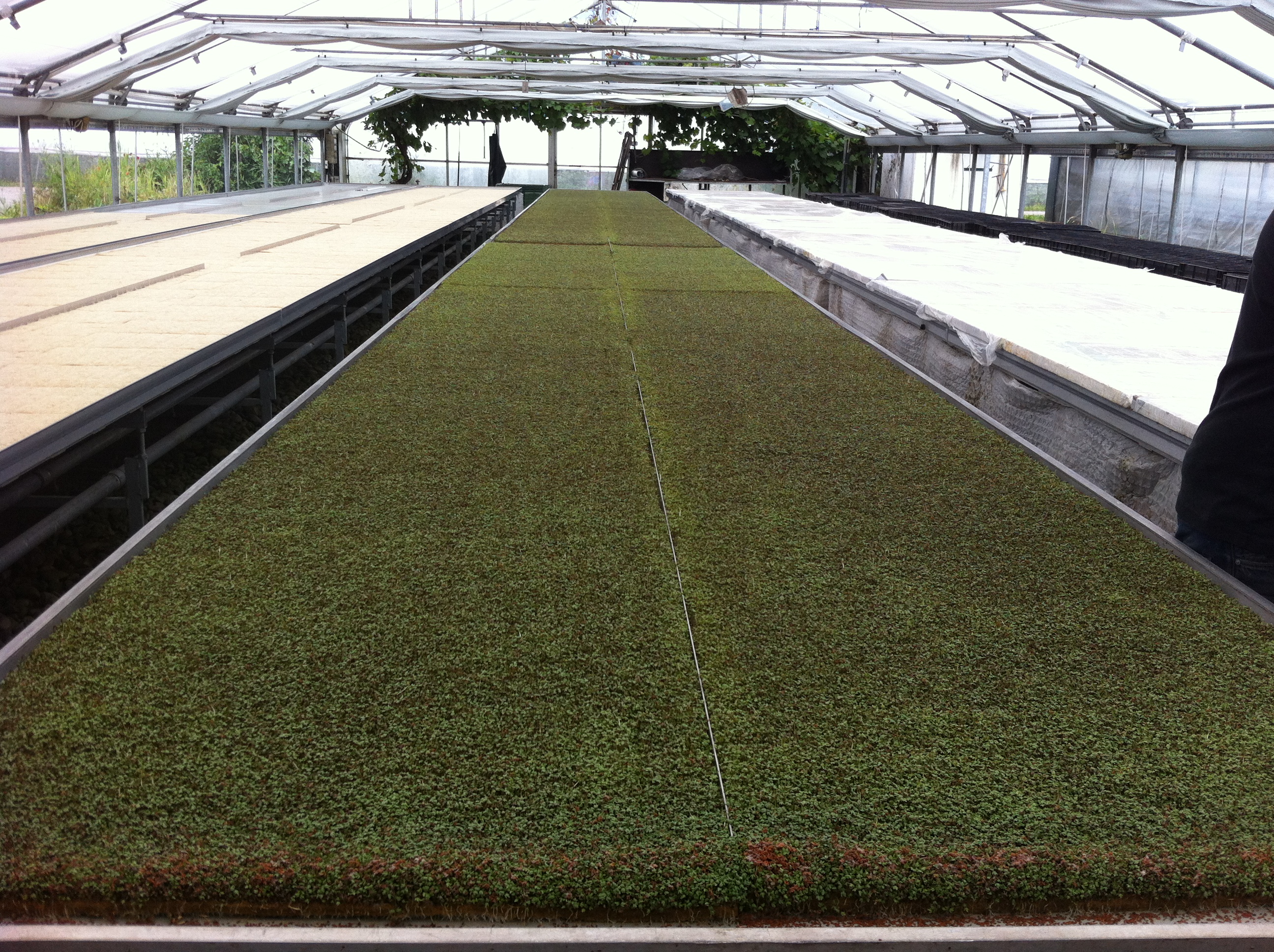 Nach dem letzten Biss in herrlichen Kuchen schließen wir uns der Gruppe von Peter Stinshoff an und sehen Unglaubliches: Ein riesiges Gewächshaus nur für Kresse. Der wird auf Hanfmatten angebaut, den ganzen Winter über beheizt und ist ansonsten recht unkompliziert. Pro Schale macht der Betrieb einen Gewinn von ½ Cent. Sie hätten mehr verdient, finden wir.