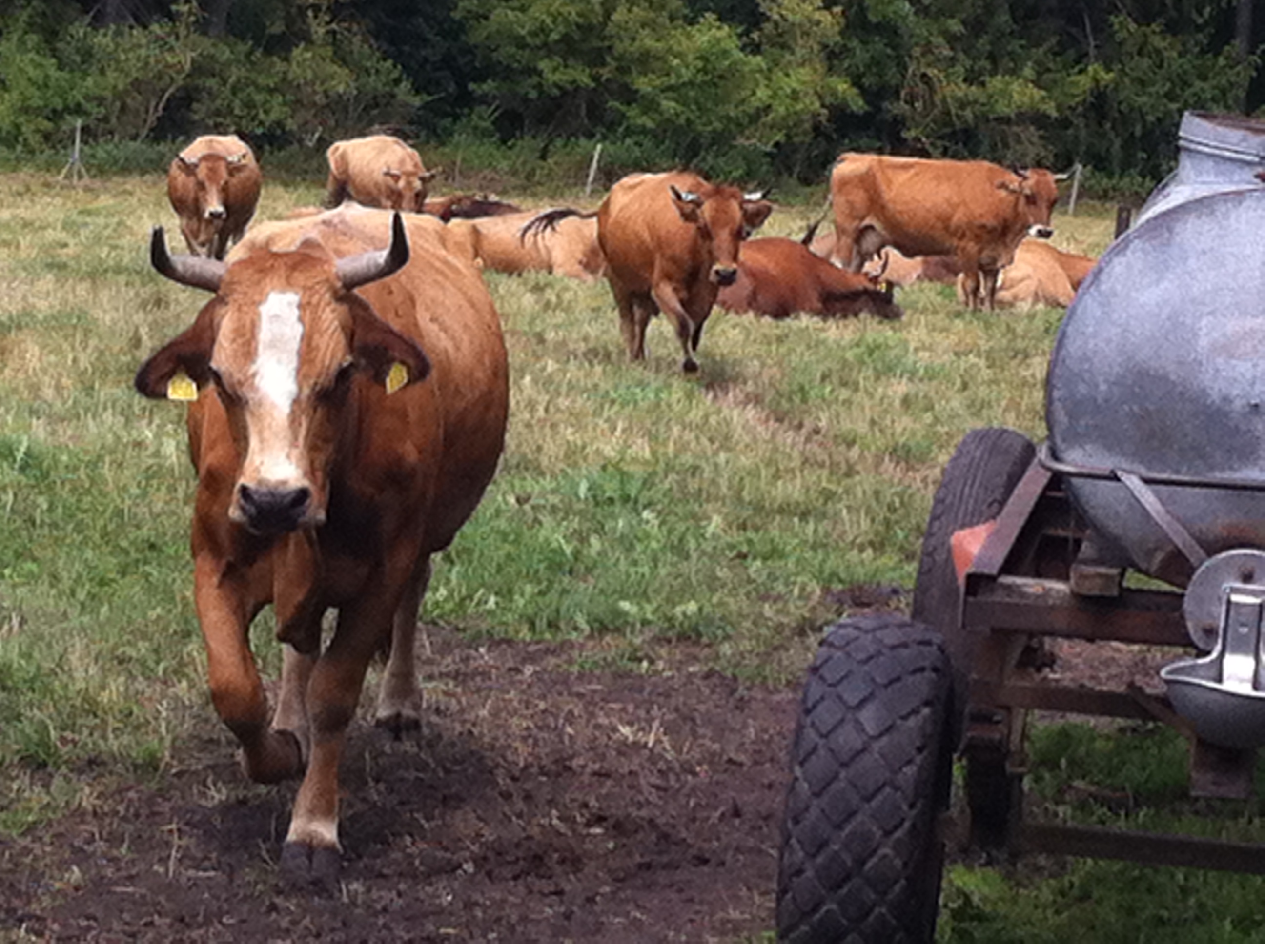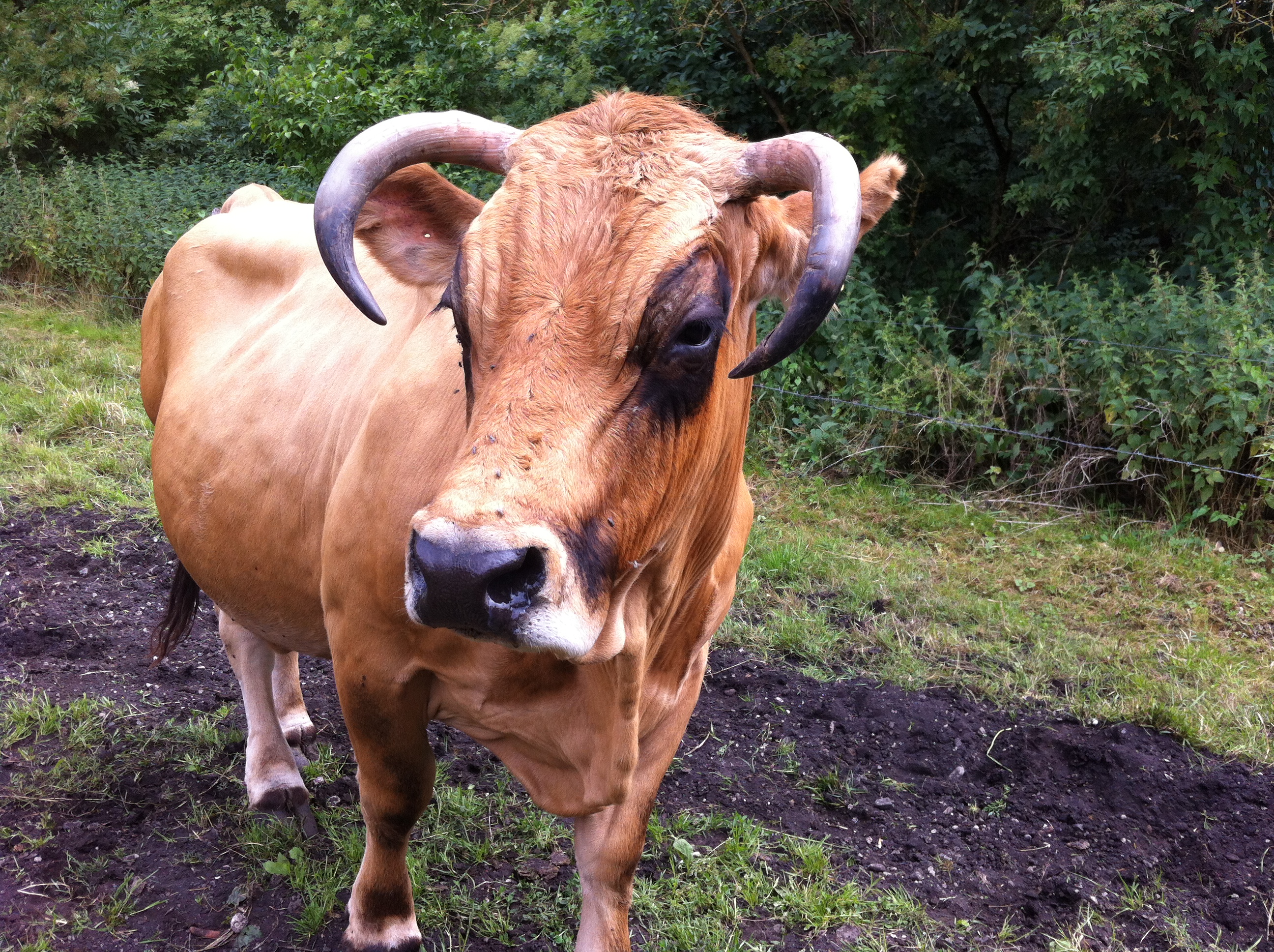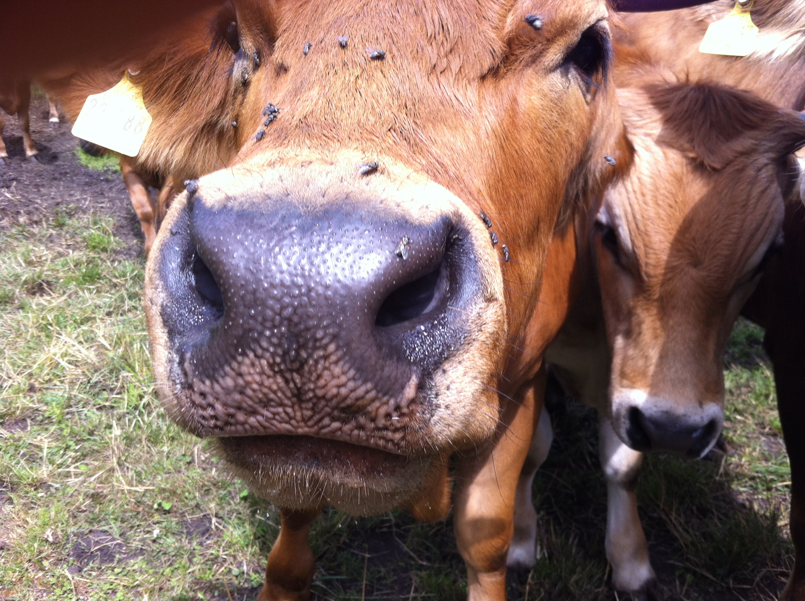 Wir halten am Rand eines Feldes und Peter hält uns eine Hand voll schon erdig riechenden Kompost unter die Nase. Spannend, welche Würmer wann welche Arbeit machen, um organischen „Abfall“ in biologischen Dünger zu verwandeln. Schließlich zeigt er uns seine Lieblinge, die Mutterkuhherde von 70 Murnau-Werdenfelser Rindern, eine alte, einheimische Rinderart, die fast vergessen und vom Aussterben bedroht ist. Es dauert eine Weile, bis die Herrschaften aus ihrem Grasbett aufstehen und sich an den Zaun bequemen, um uns „Hallo“ zu sagen. Je näher sie kommen, desto mehr beeindruckt sind wir. Welch schönen Tiere! Welch majestätischen Hörner! Die sind übrigens nicht überflüssigerweise am Kopf einer Kuh, sondern ein feines Wahrnehmungsorgan und werden deswegen am Obergrashof auch nicht entfernt.