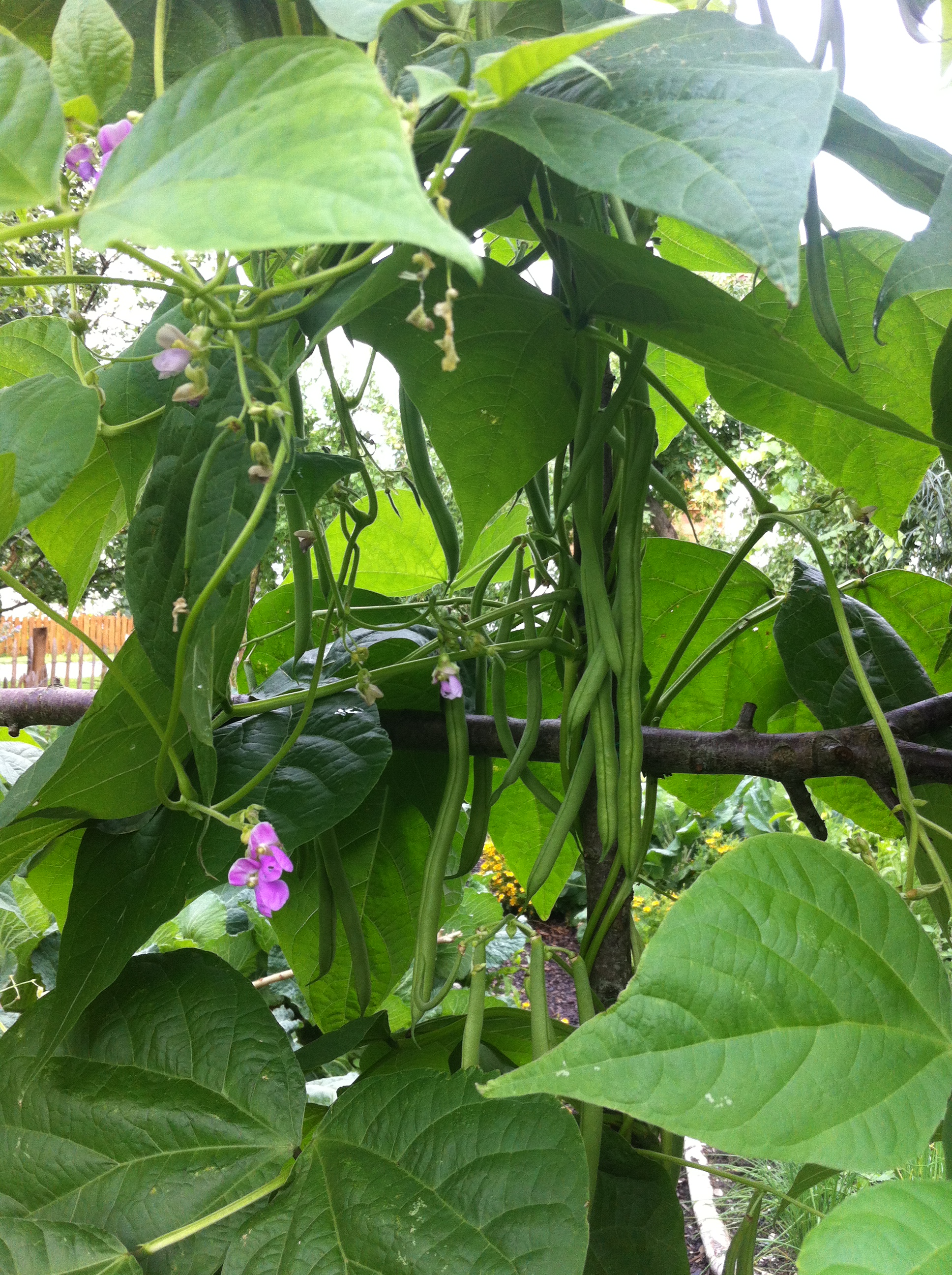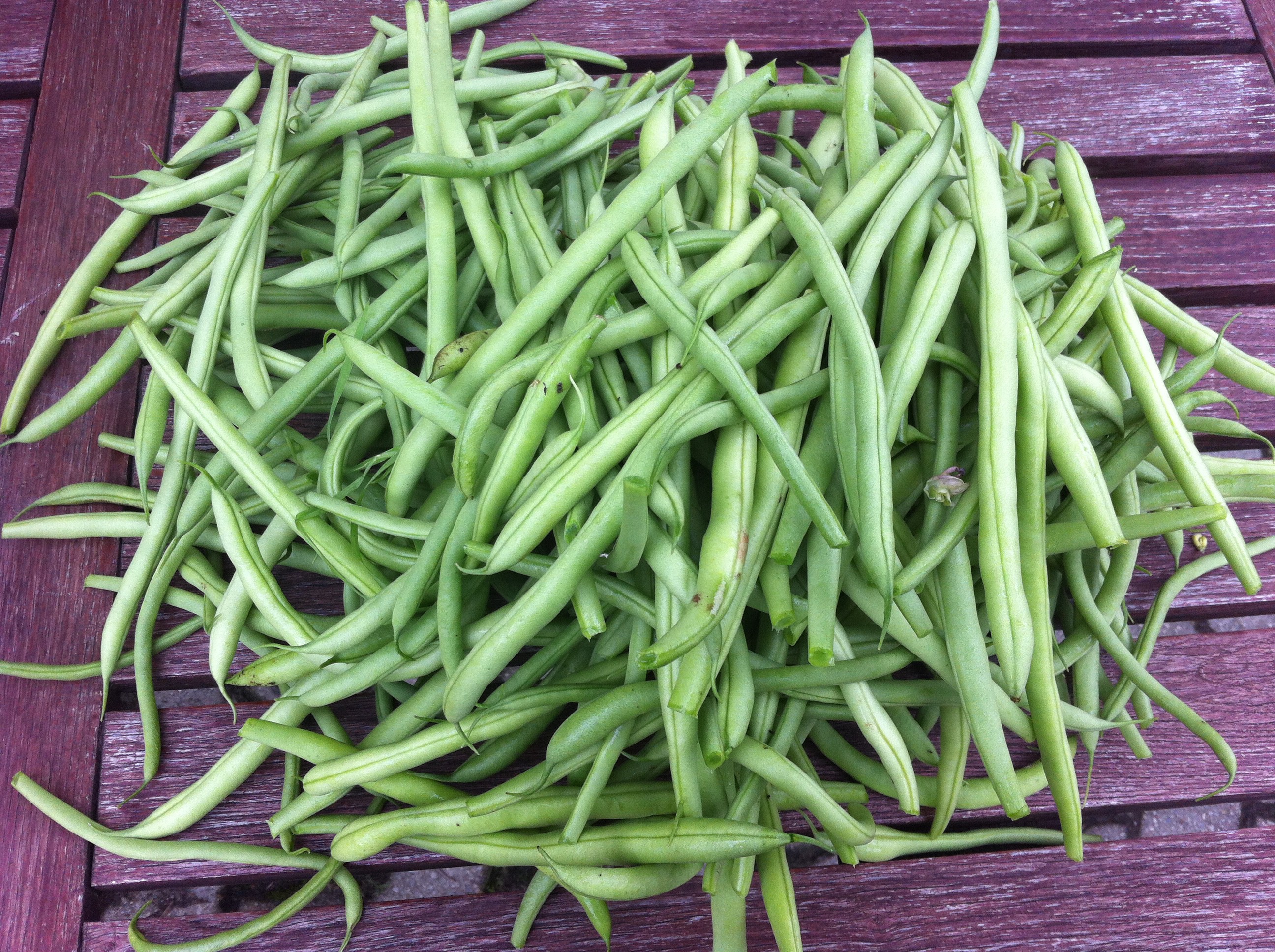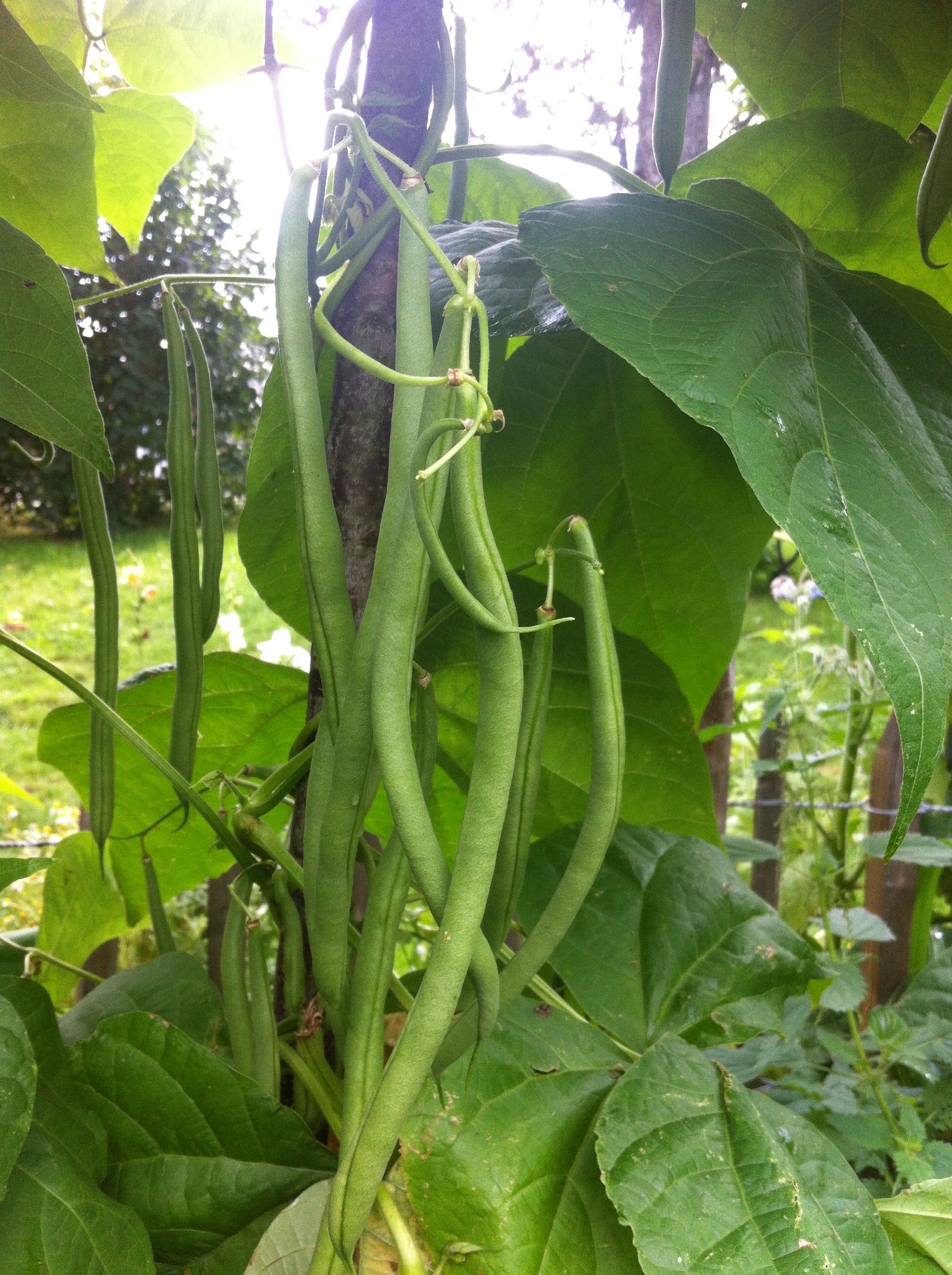 Dann kam die Bohnenflut. Erst wachsen sie über ihre Rankstangen hinaus und blühen. Man denkt sich nichts, weil die Blätter so mächtig und dicht werden. Man sieht ja nichts. Plötzlich merkt man, dass alles voll hängt, fast versteckt – und nimmt sich vor, nächstes Jahr die Stangen mal gescheit aufzustellen, damit man sich beim Pflücken nicht so verbiegen muss.