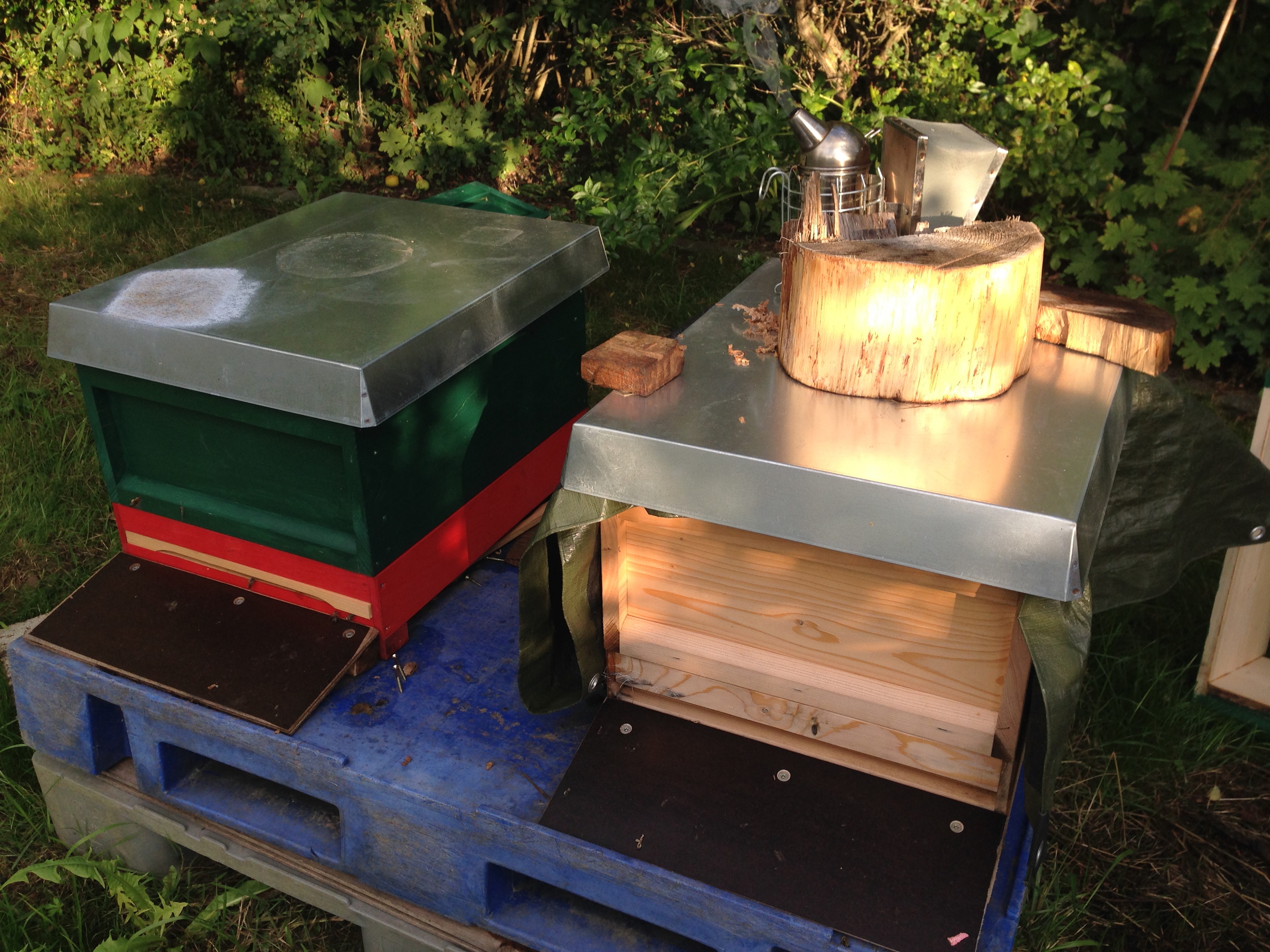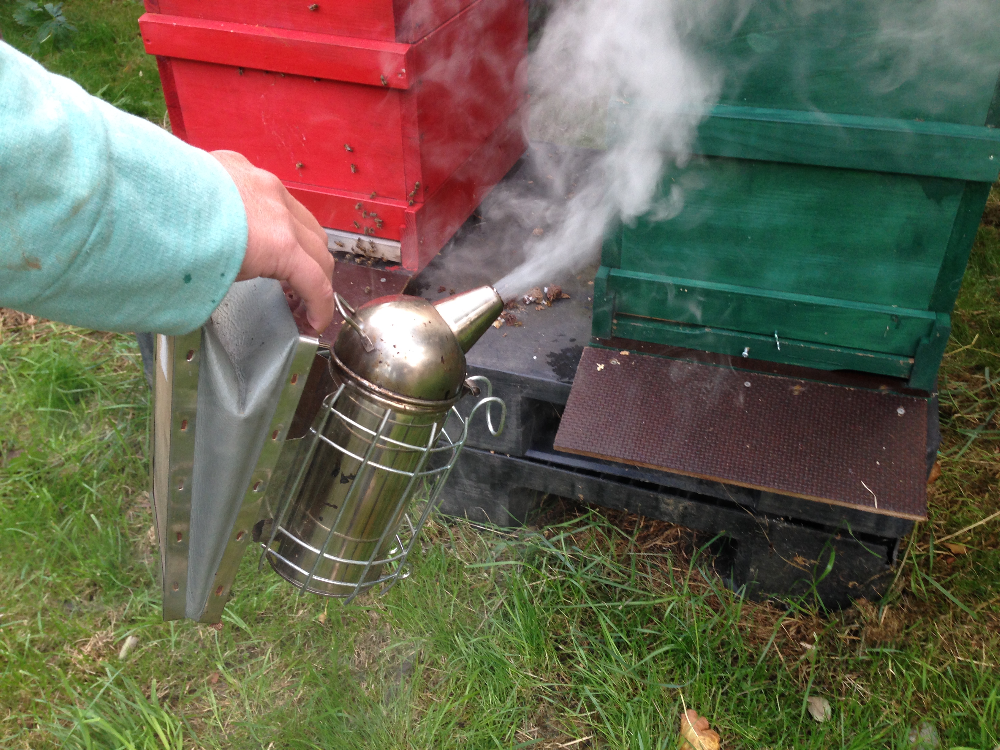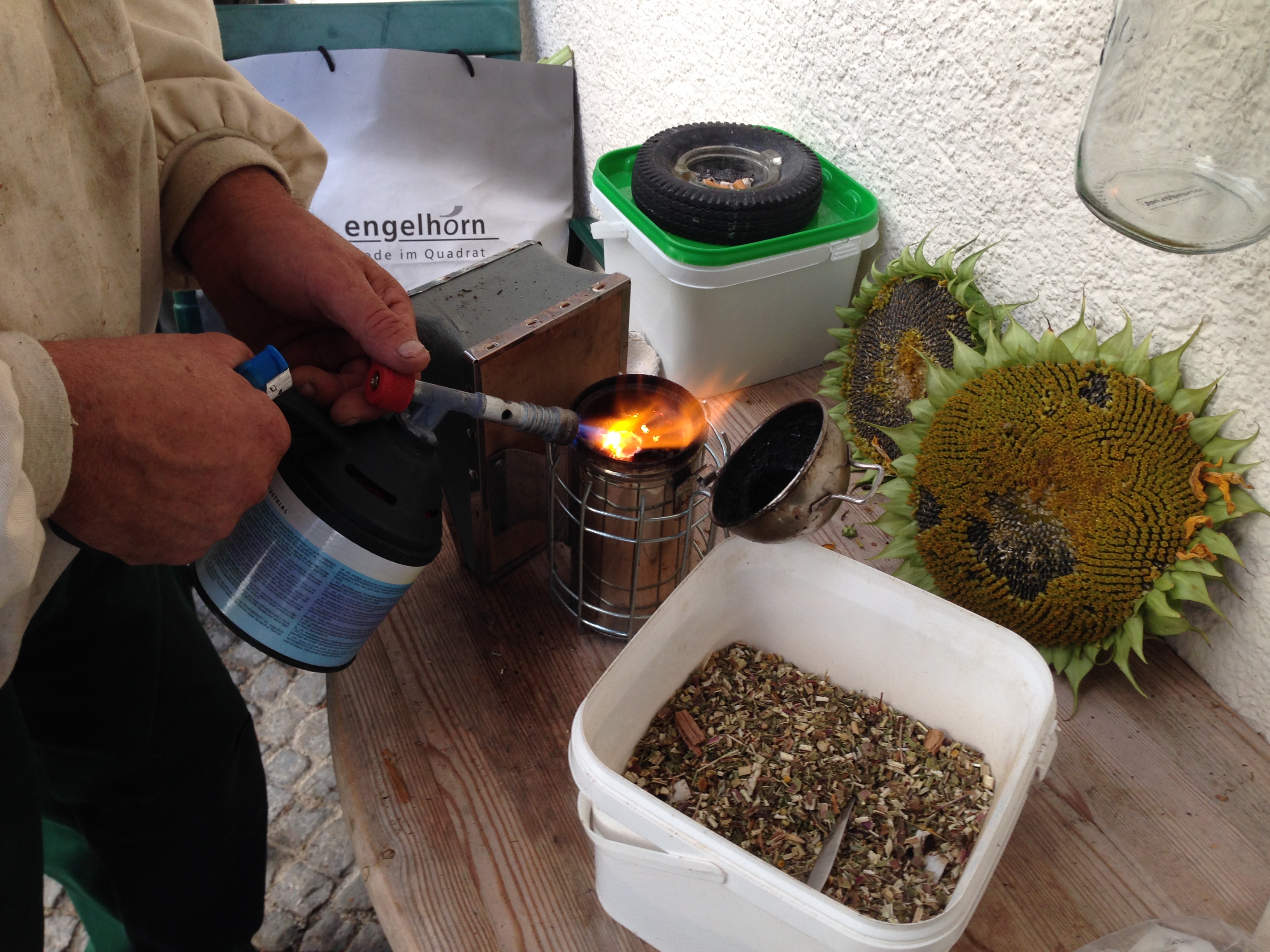 Franz ist ein konventioneller Imker. Das bedeutet, er hält seine Bienen im allgemein üblichen „Kasten“, der sogenannten Magazinbeute – also einem Bienenstock mit Boden, Zargen (Holzrahmen mit Waben) und Deckel. Es gibt auch andere Arten der Bienenhaltung von der Bienenkiste über den Strohkorb bis zur Bienenkugel. Was davon nun naturnah und wesensecht ist, davon möchten wir uns nach und nach selbst ein Bild machen, also nicht nur darüber lesen, sondern selbst anschauen und erfahren. Wir fangen mit der konventionellen Imkerei an. Franz zündet den Smoker an, der die Bienen mit Lavendelrauch beruhigen soll und wir stülpen uns die Imkerjacke mit Gesichtsnetz über.