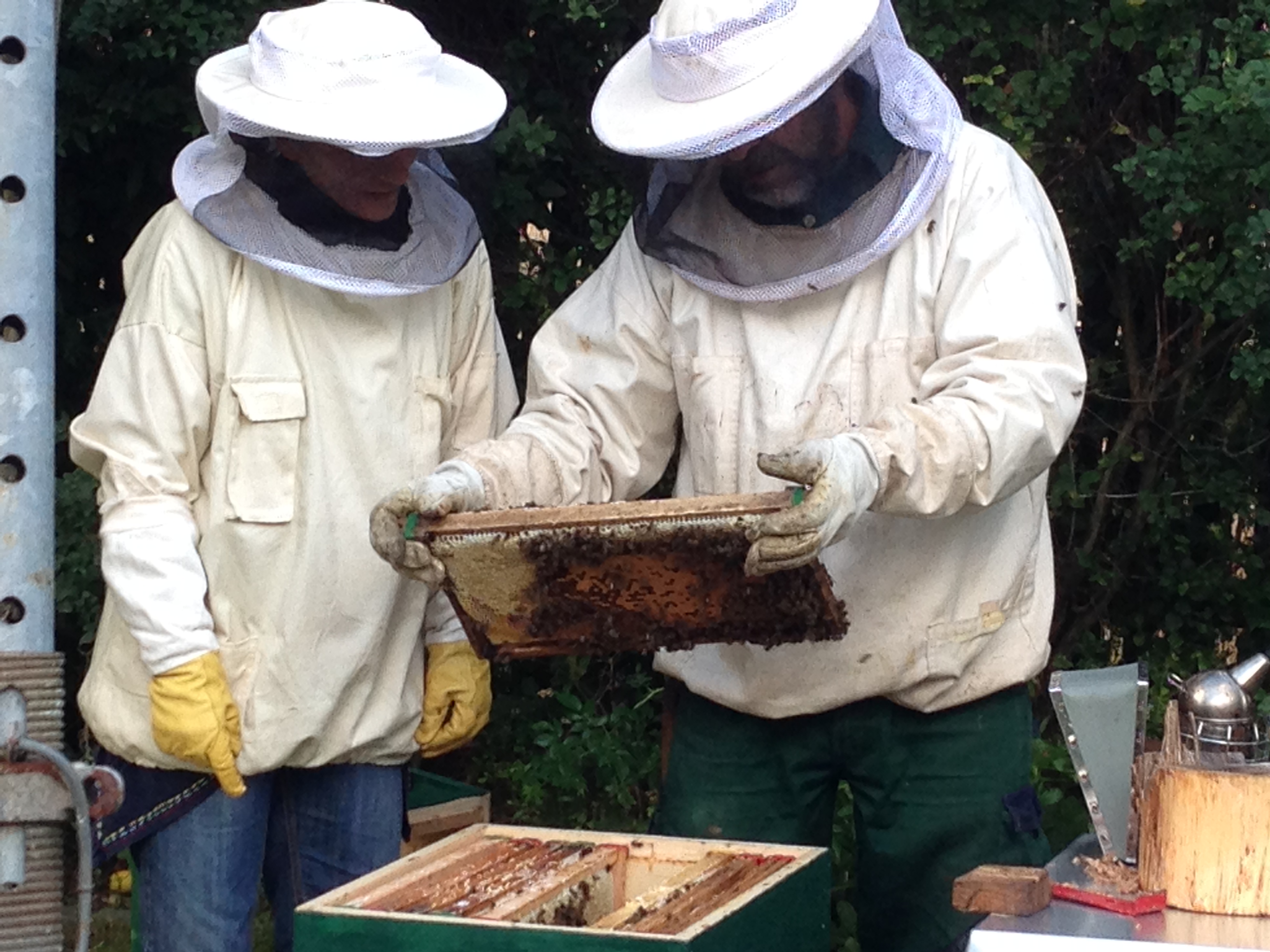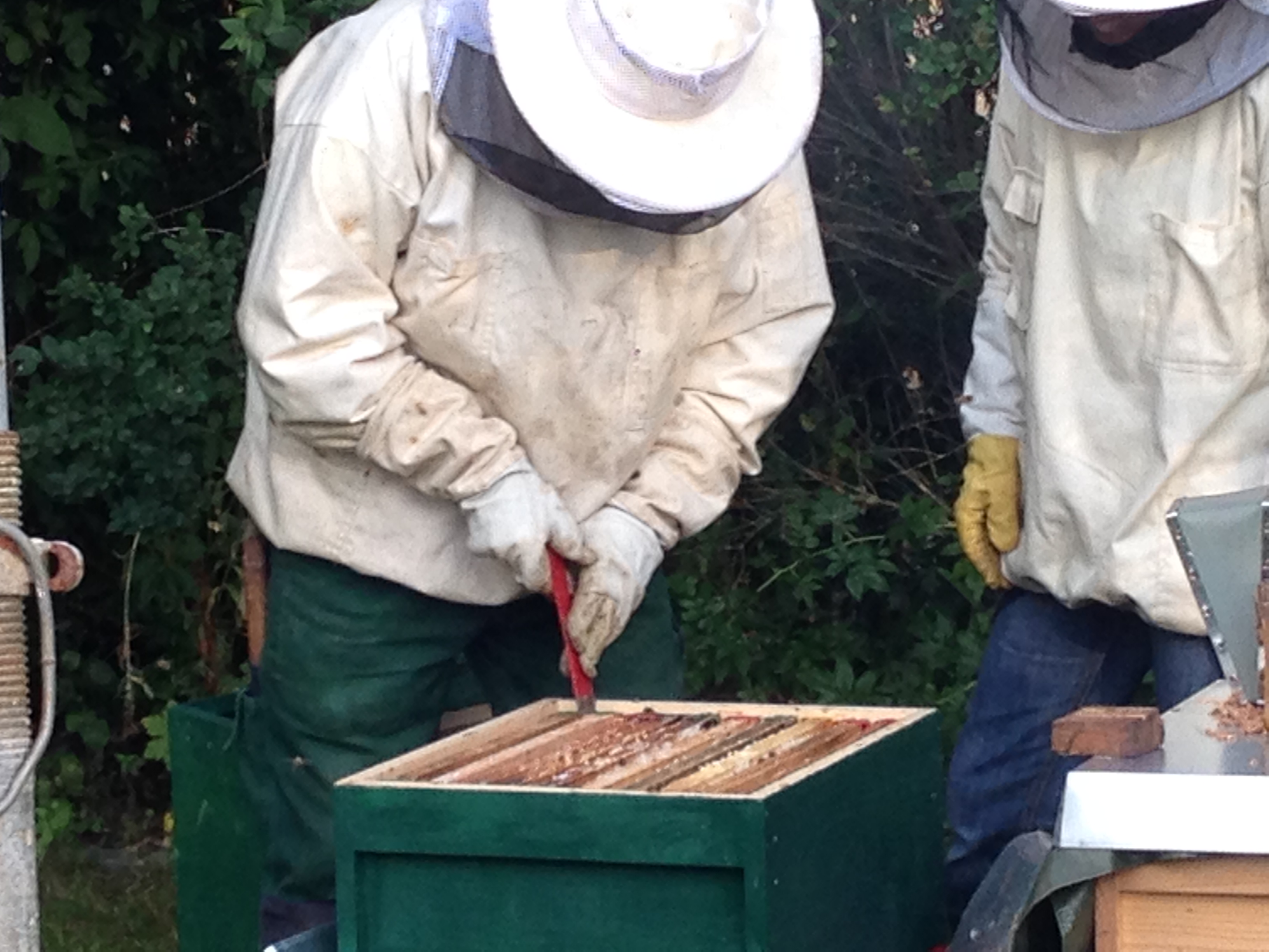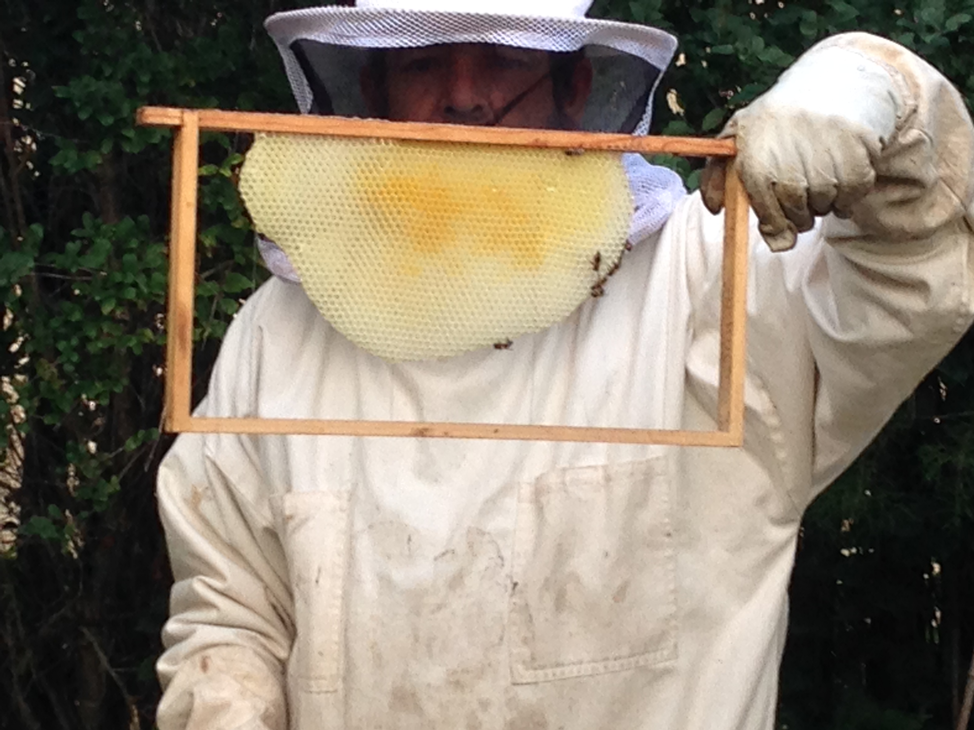 Franz befreit die Zargen (Holzrahmen mit Waben) vom Propolis, dem Kittharz, das die Bienen zum Abdichten ihres Heims benutzen und so auch gegen Krankheitserreger von außen immun machen. Jetzt kann er die Zargen herausnehmen und nachschauen, ob es den Bienen gut geht, ob sie genug zu fressen haben und gesund sind. Der große Moment für mich naht und ich darf eine Zarge selbst in die Hände nehmen, hochheben und meine benetzte Nase in die Bienen stecken. Ich sehe eine Traube von Bienen auf ihren Honigwaben sitzen, herumwuseln und summen. Franz erklärt Allerlei, von dem ich gar nichts mitbekomme. So fasziniert bin ich von diesen Wesen. Ich rieche Wachs und Honig, lege meine gummibehandschuhte Hand auf die Bienenrücken und spüre ihr Treiben. Es ist ein Unterschied, irgenwo eine fremde Biene fliegen zu sehen, oder den Bienen als Gast in ihrem Zuhause nahe zu kommen. Ich kann nicht anders, ich liebe diese Bienen.