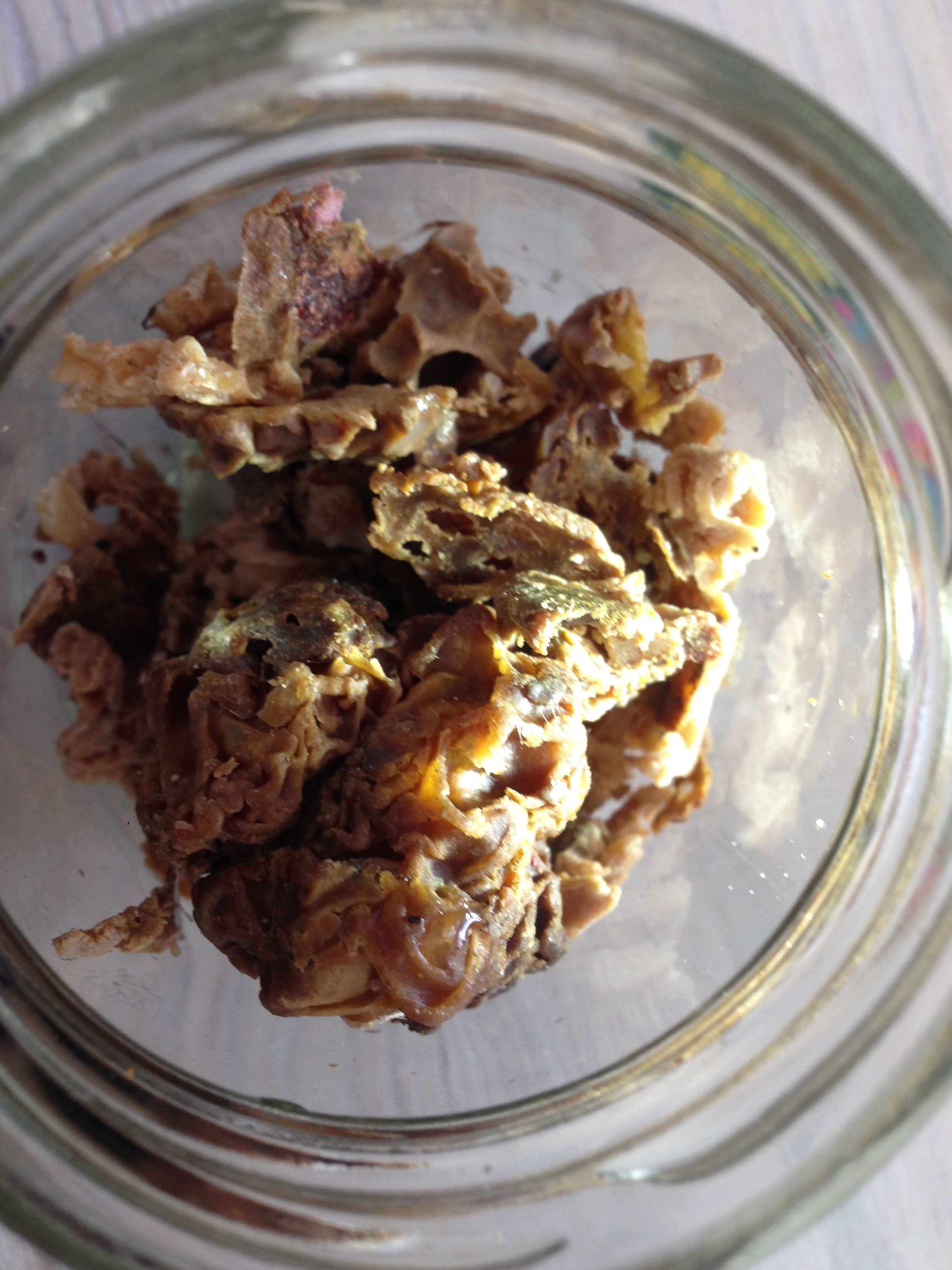 Wir sammeln das heute erbeutete Propolis ein, das wir gut für selbstgemachte Zahn- und Gesichtscreme verwenden können – sobald wir uns schlau gemacht haben, wie man eigentlich das Propolis reinigt und eine Tinktur herstellt.