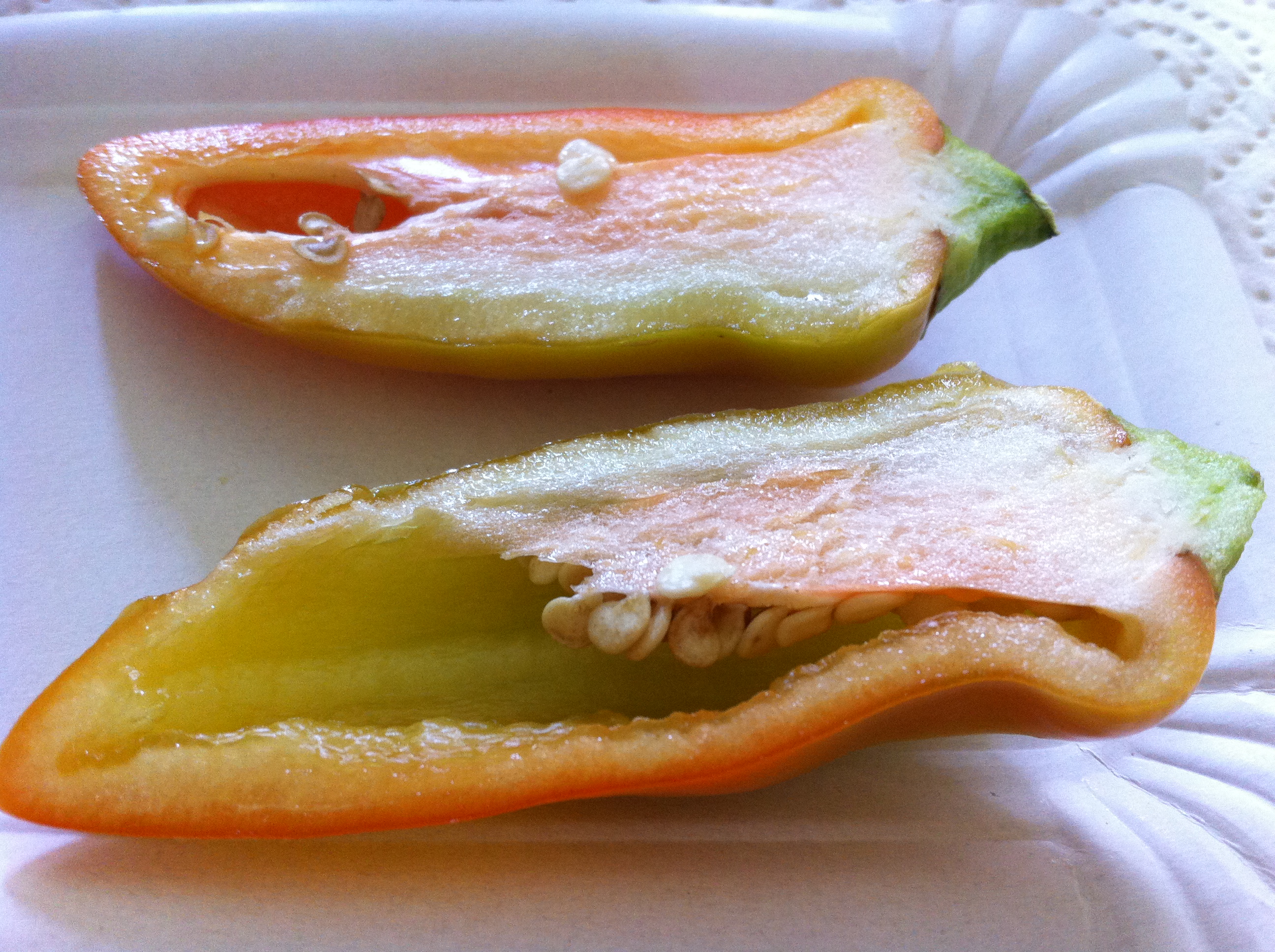Und wie gehen wir jetzt eigentlich vor, wenn wir von einer Pflanze die Samen nehmen wollen? Angenehm wäre ja, einfach schön eine Tomate oder Bohne oder Paprika nach der anderen zu essen und die letzte, die übrig bleibt, für die Samenernte zu verwenden. Pustekuchen, so geht das nicht, lerne ich von Annette. Man nimmt nicht die Früchte, die als letztes reif werden, sonst würde man ja die späte Reifezeit als Eigenschaft der neuen Pflanze mitzüchten. Logisch, irgendwie. Man nimmt auch nicht die erste Frucht, denn die ist vielleicht nicht die schönste. Man stürzt sich auf die Beste und Schönste aus den ersten paar reifen Früchten und markiert sie mit einem Faden oder ähnlichem. Dann muss man warten, bis die Frucht fast schon reifer als reif ist und die Samen gut ausgebildet sind. Und natürlich hoffen, dass sie zu diesem Zeitpunkt nicht doch gegessen ist, versehentlich, versteht sich.