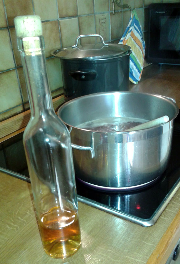 Es riecht bald im ganzen Haus nach Äpfeln und Zimt, denn sowohl Apfelmus als auch der Saft werden vorsichtig gewürzt. Langsam köchelt der Saft auf dem Herd, Schwaden steigen auf, ich bin froh um jeden Milliliter Wasser, der verdampft. Das macht das Gelee nur besser und stärker im Geschmack. Und dann: Kurz bevor der Zucker zugeführt wird, kommt noch ein ordentlicher Rum hinzu. Auch diese Geheimtipps habe ich von meiner Mutter übernommen. Sie hat immer wild experimentiert: Pflaumenmarmelade mit Cognac, Birne mit Whisky, Apfel mit Rum… oder eben was ihr an Kombinationen vielversprechend vorkam. Und was schmeckt, habe ich übernommen: Bei uns gehört in viele Marmeladen etwas Gewürz, ein Schuss aromatischer Alkohol, und da, wo es passt, Bitterschokolade. Das Ganze muss natürlich ausgewogen sein, denn obwohl der Alkohol vollständig verdampft, will man ja eher selten zu Sonntagsfrühstück den Geschmack der Tropicana-Bar auf der Semmel haben. Denn der Rum-Geschmack bleibt ja zurück.