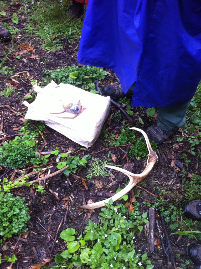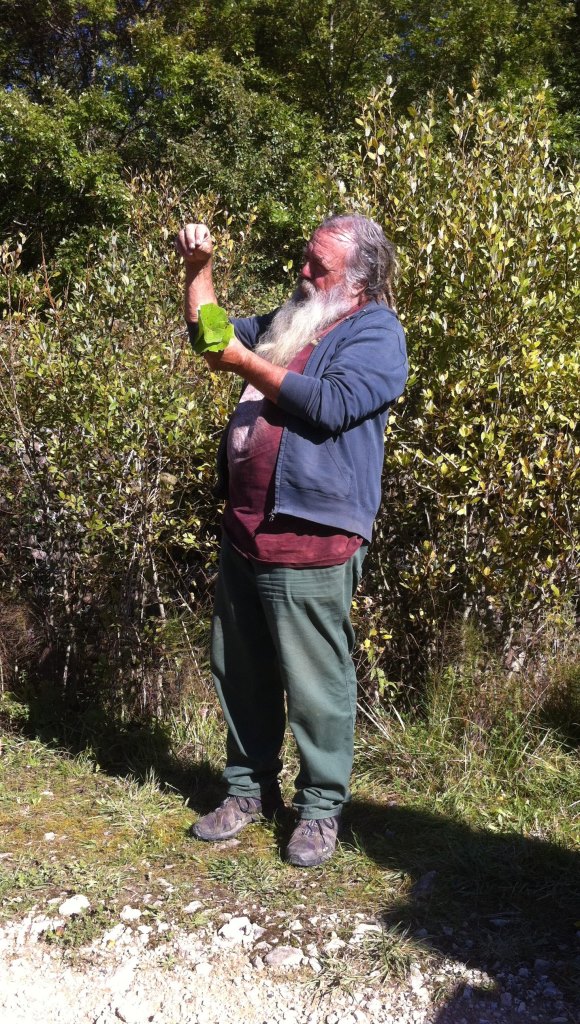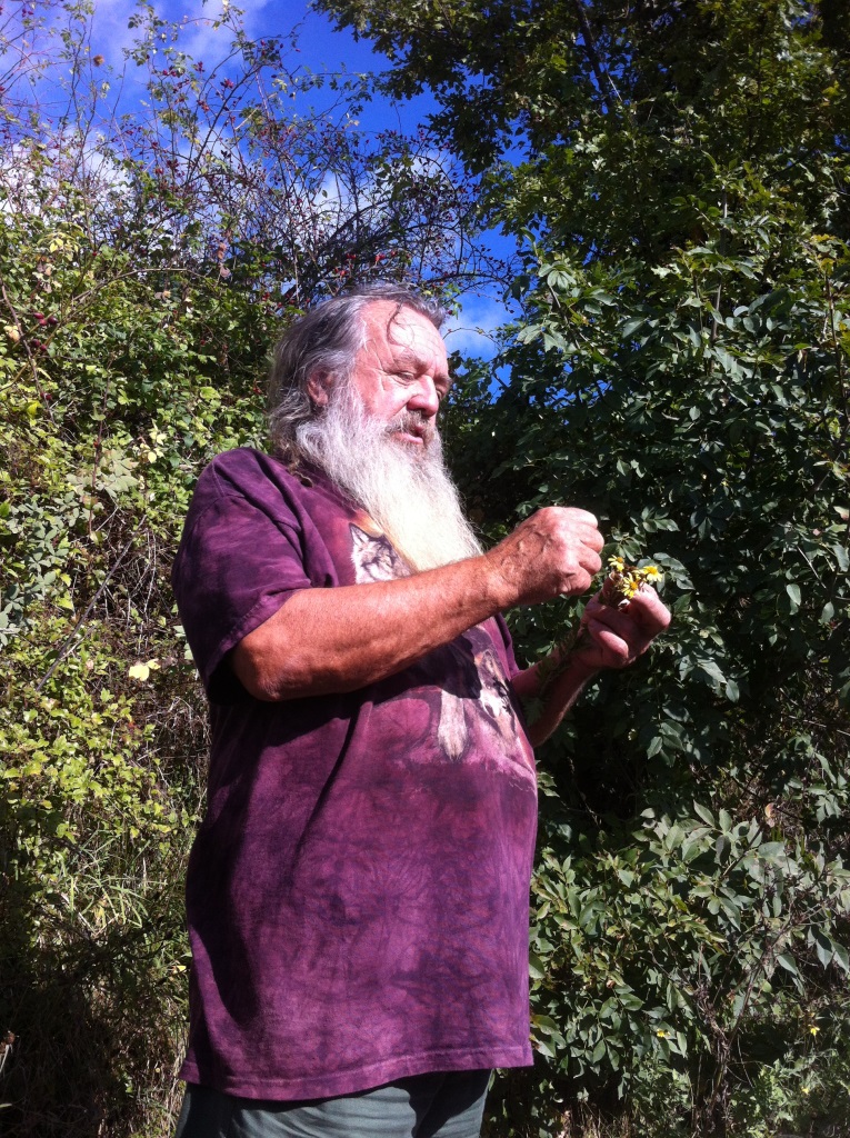 Unser erster Seminartag beginnt mit einer Wanderung. Wir schultern unsere Rucksäcke, gefüllt mit Wasserflaschen, Proviant, Isomatte, Jacke, Schreibwerk und – wichtig – Schokolade. Wolf-Dieter Storl hat eine Stofftasche mit Stapeln von Notizzetteln umgehängt und trägt in der Hand die Hälfte eines Hirschgeweihs. Die Notizzettel sind zum Nachschlagen in seinen eigenen Recherchen und das Geweih ist zum Ausgraben von Pflanzen. Mehr braucht er nicht. Wir schauen uns um. Die anderen 26 Teilnehmer gehen genauso auf Nummer sicher wie wir, alle sind bis an die Zähne mit möglicherweise nützlichen Überlebensutensilien bewaffnet. Aber eine Wanderung mit Wolf-Dieter ist eher ein ruhiges Schlendern von Pflanze zu Pflanze, mit sehr langen Pausen, in denen er Geschichten erzählt.