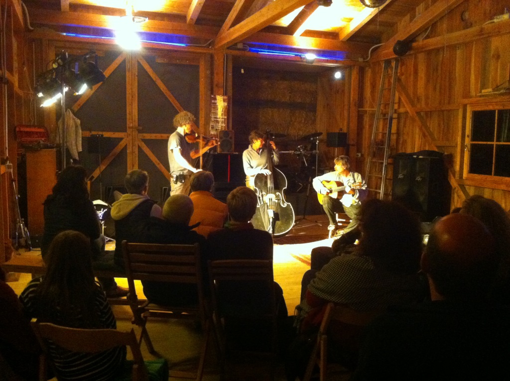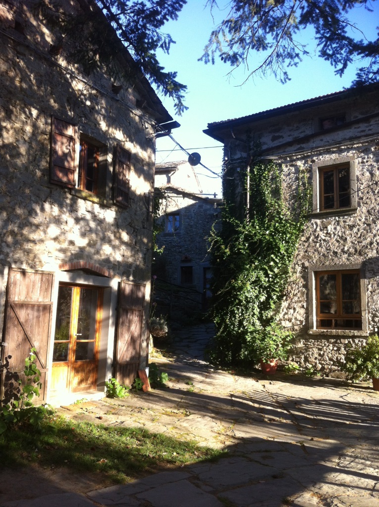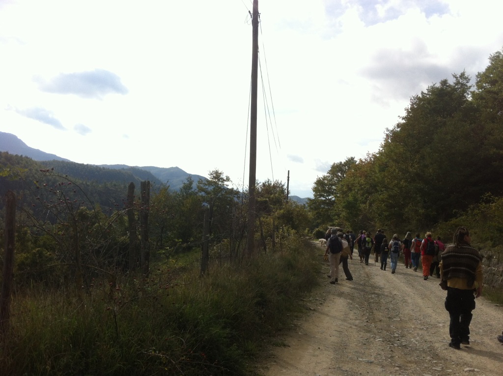 Am Abend lungern wir vor dem Haupthaus von Doccione herum und genießen den atemberaubenden Blick auf unverbaute Berge. Vom Abendessen erwarten wir hier in der Pampa nicht viel, bis uns ein vorzügliches drei Gänge Menü überrascht. Wir spüren die Herzlichkeit unserer Gastgeber Renate und Andreas, die vor zwanzig Jahren aus Berlin ins Vallesanta kamen und den Gutshof renovierten. Sie bieten unserer Seminargruppe an, ein kleines Konzert zu geben. Wir denken: Gut, ein bisschen halbgare Hausmusik kann nicht schaden. Was wir dann erleben ist ein leidenschaftlich spielendes Folklore-Trio aus Geige, Kontrabass und Gitarre, das uns völlig in seinen Bann schlägt: Vallesanta Corde. Mazedonische, türkische und jüdische Melodien, gepaart mit Tango und Swing, erobern unsere wackelnden Hüften. Landwirtschaft, Gästehaus und Musik auf Weltniveau – wie machen sie das alles? Später am knisternden Lagerfeuer sitzend, nehmen wir uns vor, vielfältiger zu werden!