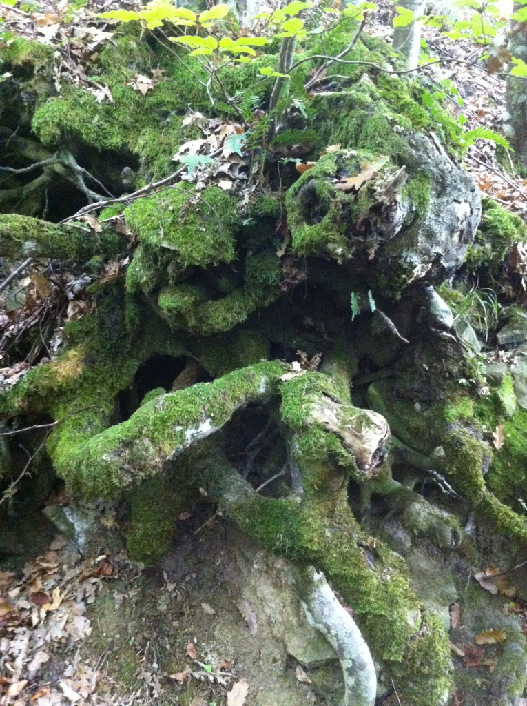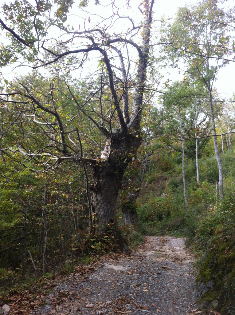 Hungrig beißen wir in unsere Käsebrote, um für die Baummeditation gewappnet zu sein. Die Kursteilnehmer verstreuen sich im Wald. Jeder sucht sich seinen Baum, um darunter zu sitzen und Kraft zu sammeln. Hier gibt es so viele uralte Kastanienriesen und knorrige Eichen, wir wissen gar nicht, wohin wir schauen sollen. Der Wald beeindruckt uns. Weit und breit kein wirtschaftlich rentables Nadelgehölz wie zu Hause. Es ist ein bunter Herbsthexenwald mit Baumwesen. Wir finden eine alte Kastanie, setzen uns zu ihren Füßen hin und genießen ihre Nähe. Nein, keine Elfen und keine Devas schenken uns Beachtung, die Baumerleuchtung lässt noch auf sich warten. Aber wir ahnen, dass jeder Baum seine Eigenschaften hat, in die man sich sehr wohl vertiefen kann.