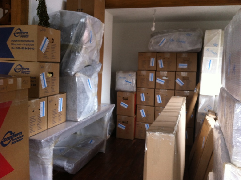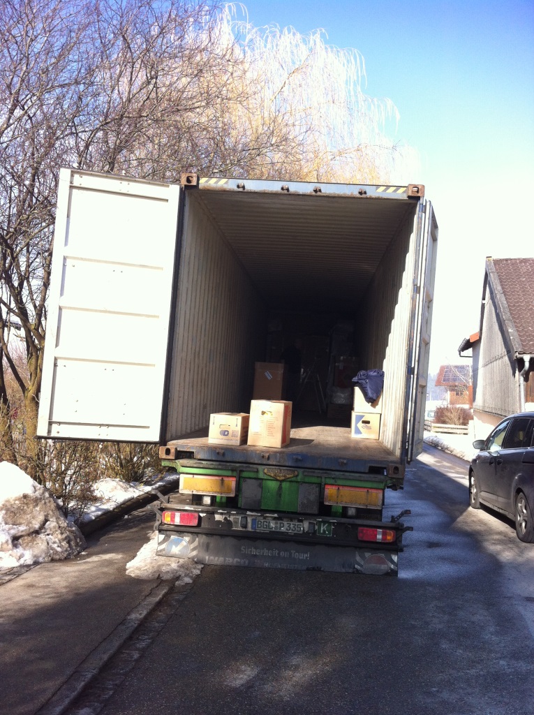 Der Schnee hat ihn doch nicht aufhalten können und die fünf starken Umzugsmänner sehen nicht so aus, als wollten sie die in den letzten zwei Tagen akkordmäßig gefüllten Kartons und säuberlich eingeplastikten Möbelstücke wieder auspacken. Wir unterschreiben die Liste für den amerikanischen Zoll. Der Inhalt von über 300 Paketen vom einzelnen Karton bis zu Schrankteilen und Regentonne ist ordentlich aufgeführt, alles ist etikettiert und nummeriert. Aha, doch so viel. An unserem sparsamen Selbstversorger-Leben müssen wir wohl noch weiter arbeiten.