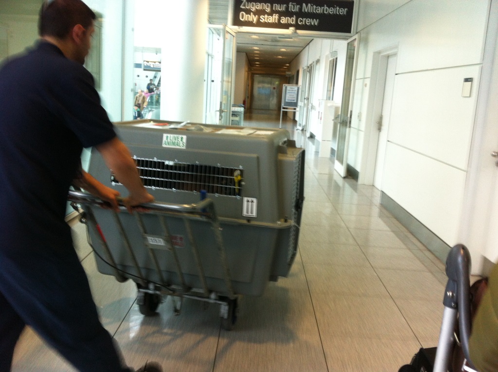 Am Flughafen München bringen wir die Hunde an den Sperrgut-Schalter. Das ist nicht so schlimm, weil das haben wir schon einmal geübt und den Flughafen kennen sie. Die Boxen werden von der Security durchsucht und bekommen diverse Schildchen aufgeklebt. Mulmig wird uns, als die Hunde in ihren Boxen auf den Sperrgut-Wagen geladen und davon geschoben werden, in die uns unbekannte Welt des Flugzeugbauchs. Hoffentlich haben sie verstanden, dass wir sie nach einer Nacht im fliegenden Auto wieder abholen und alles gut wird. Kaum sind wir selbst an unserem Platz, nerven wir schon die Ober-Stewardess, ob sie nachfragen kann, ob unsere Hunde auch wirklich an Bord sind. Der Pilot erhält vor Abflug eine Durchsage, was alles geladen ist. Und ja, unsere Hundis sind dabei.