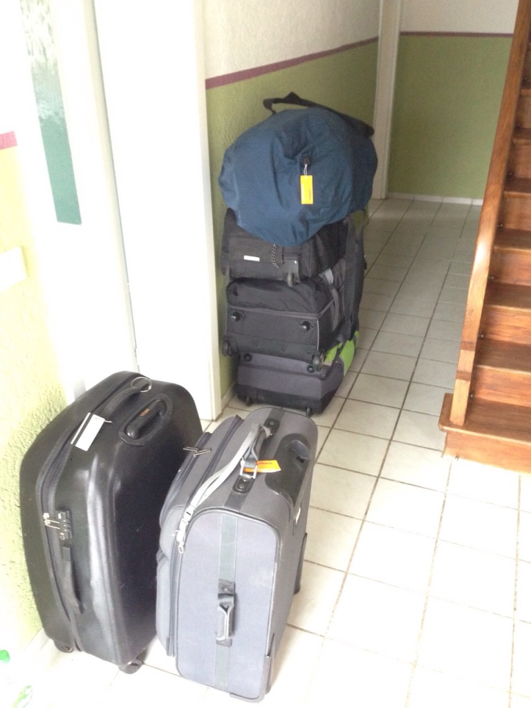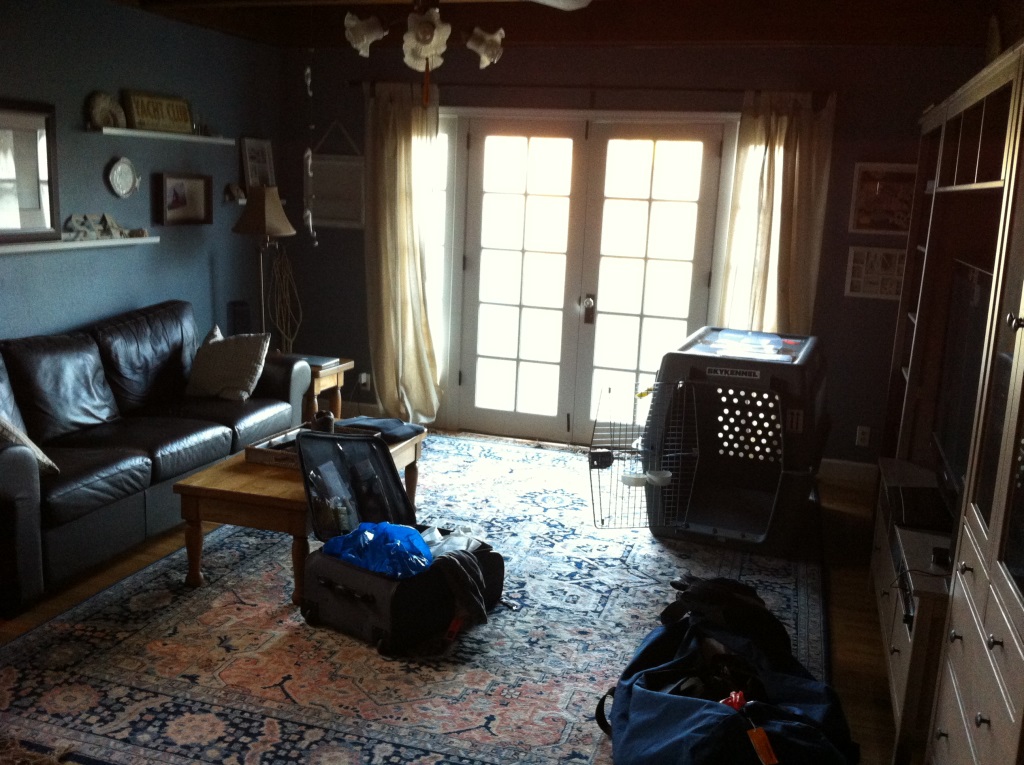 Nach einer gar nicht so unbequemen Nacht auf der Luftmatratze ist Valentinstag – unser Flugtag. Die Hunde haben sich die letzten zwei Monate an ihre Transportboxen gewöhnt und wir knuddeln sie nochmal ganz fest, bevor die große Reise im fliegenden Auto beginnt. Die Koffer stehen bereit, das Großtaxi kann kommen.