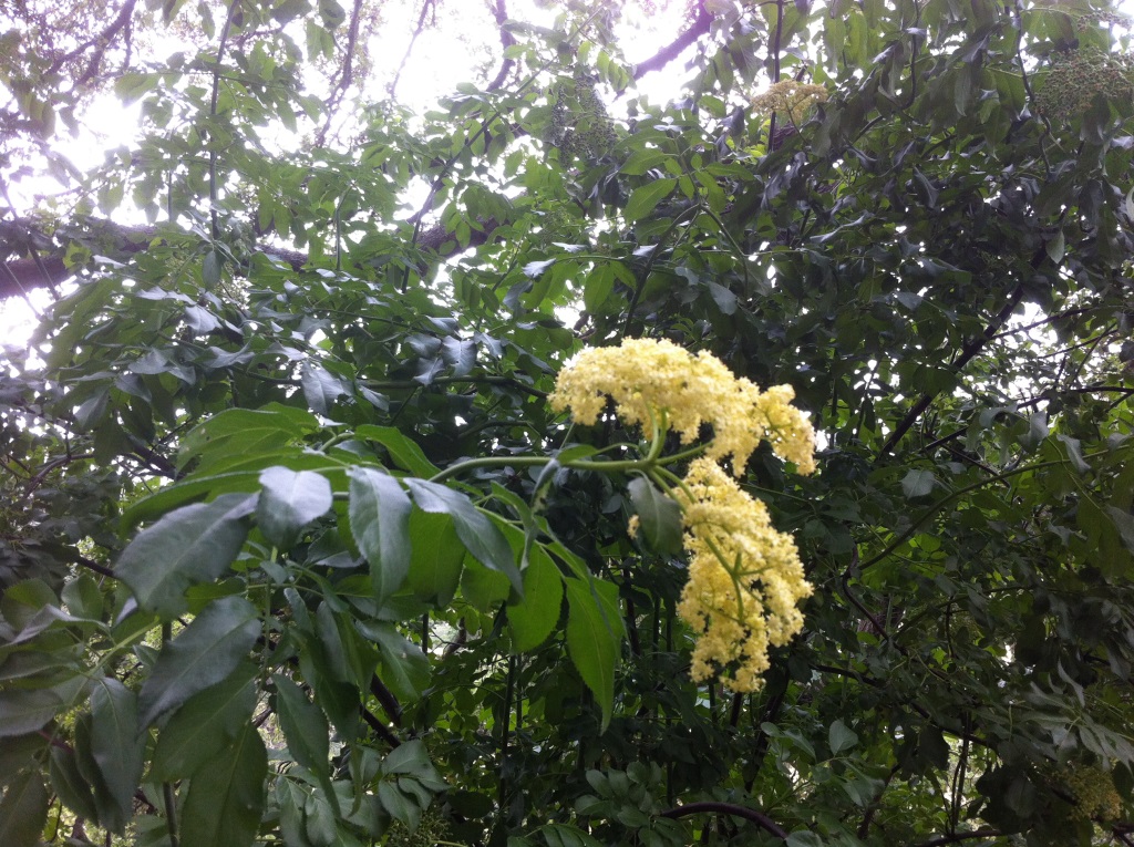 Der kalifornische Schwarze Holunder (ich lerne engl.: Black Elderberry, lat.: Sambucus canadensis) sieht aus wie der deutsche Holler (lat. Sambucus nigra) und wird auch ähnlich verwendet. Warum sie unterschiedlich riechen kann an den verschiedenen Bestandteilen des Bodens liegen, auf dem sie wachsen, oder an ihrer Art. Ich muss mich erst noch daran gewöhnen, lasse die Blüten hängen und mache vorerst keinen Sirup daraus, wie letztes Jahr noch in Bayern.