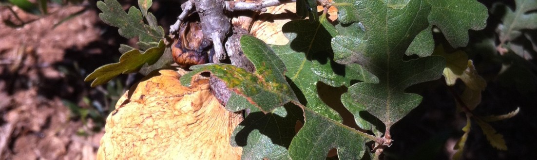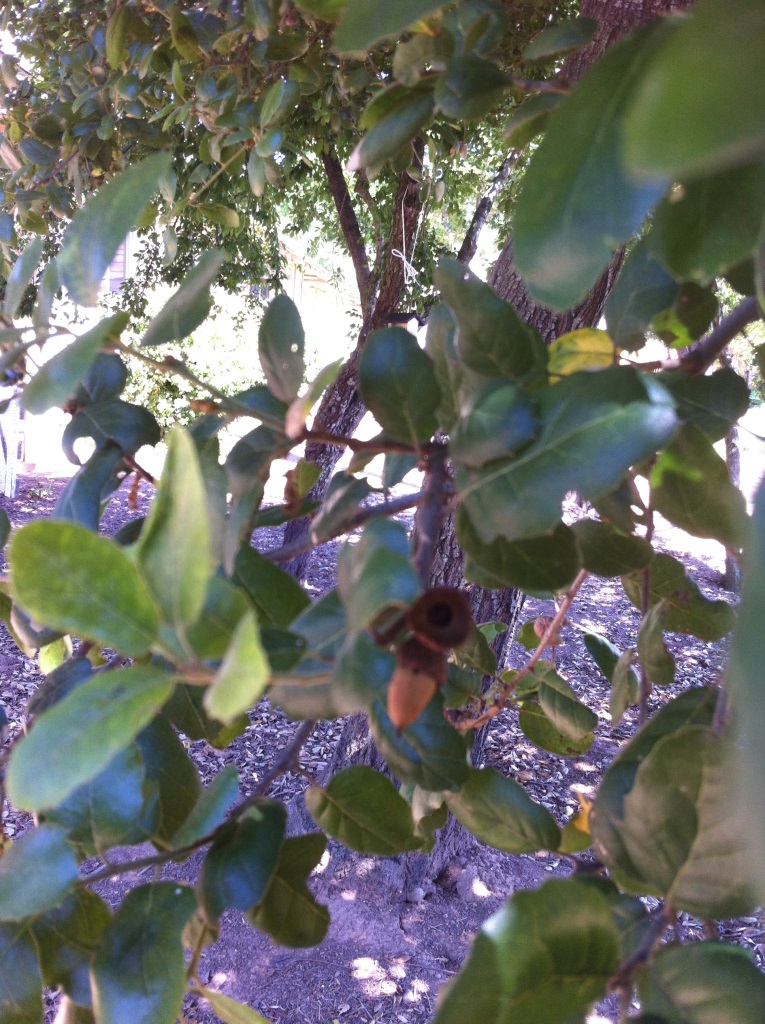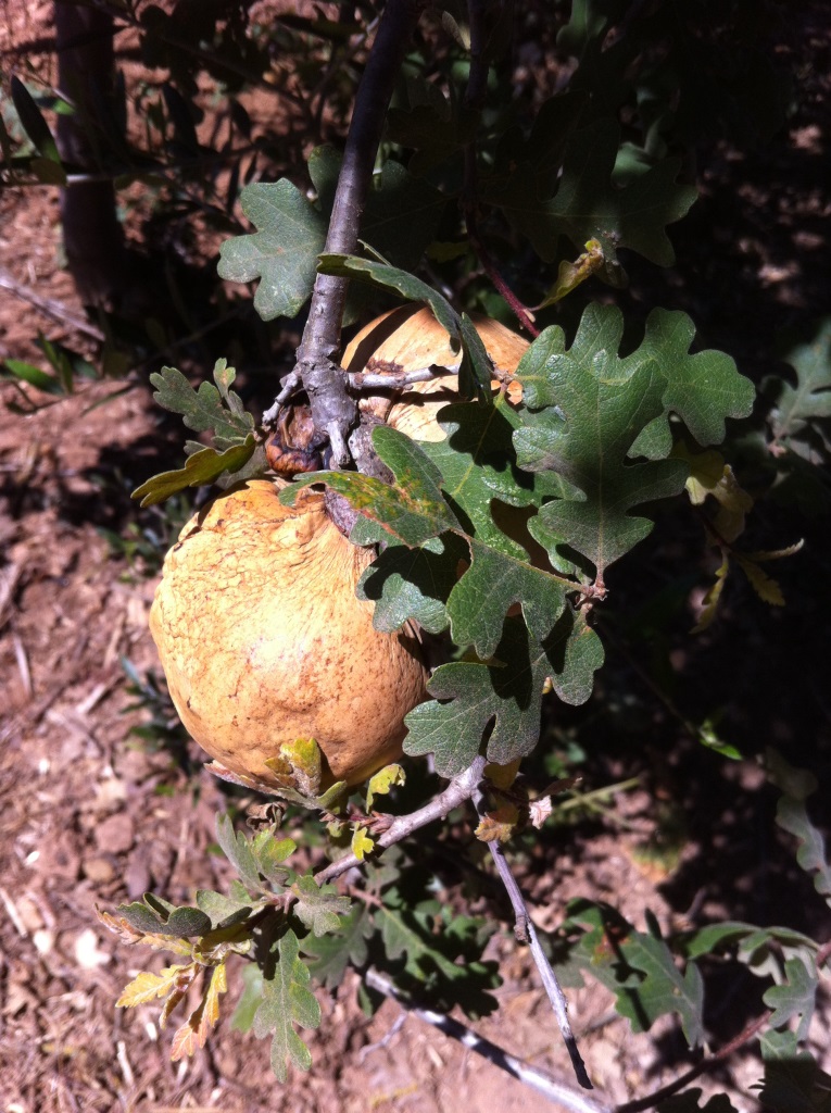 Die Deutsche Eiche (lat. Quercus robur), lerne ich, ist eine sogenannte Stieleiche und hat ausufernde kalifornische Verwandschaft. Sie ist gar nicht so urdeutsch, wie ich gedacht habe. Auch die Indianer haben Eicheln mit Steinen zu Mehl zerrieben. Der Stieleiche am ähnlichsten ist vielleicht die White Oak (lat. Quercus lobata). Die entdecke ich im Garten, vollgehängt mit Gallen der Gallwespe.