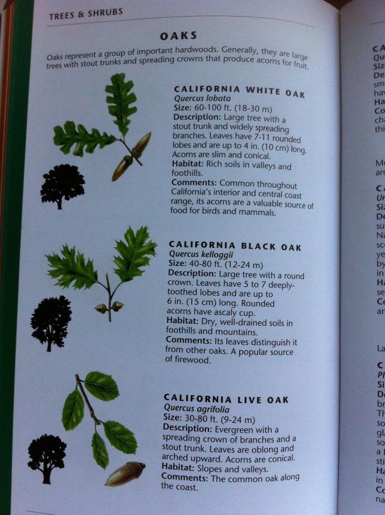 Was mich am allermeisten an der mir neuen Pflanzenwelt verwirrt ist die Eiche. War sie doch ein so einzigartiger Baum und an den Blättern so einfach zu erkennen. „Eiche“ heißt ins Englische übersetzt „Oak“. Was mir als erstes unter diesem Begriff über den Weg läuft, erzeugt bei mir gar kein Eiche-Hallo-Gefühl. Die Blätter sind rundlich und hart.Die Eicheln sind länglich und laufen spitz zu. Aha, denke ich, als ich in dem Naturführer „The Nature of California“ nachlese (siehe Foto): Es gibt die gerade beschriebene Live Oak, außerdem die Scrub Oak, die Black Oak und die White Oak.