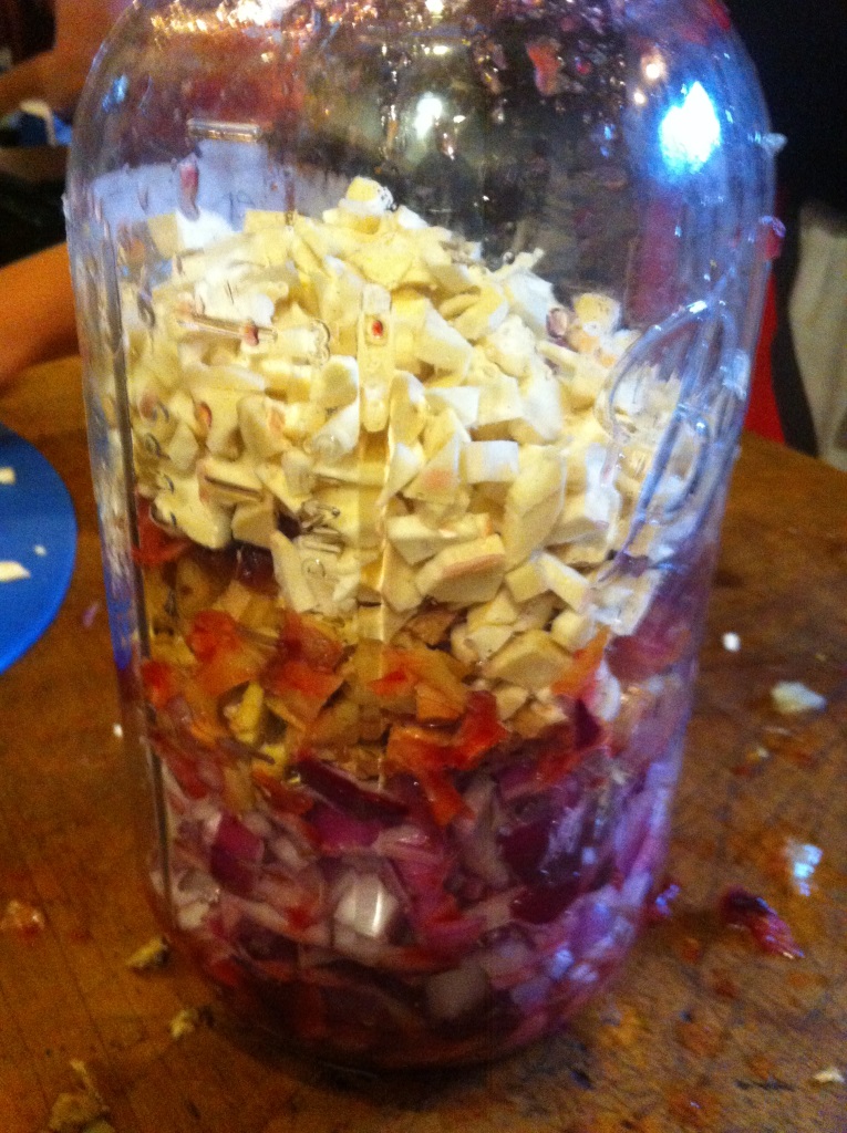 • Alles kleinschneiden, in ein Glas geben und mit Apfelessig bedecken