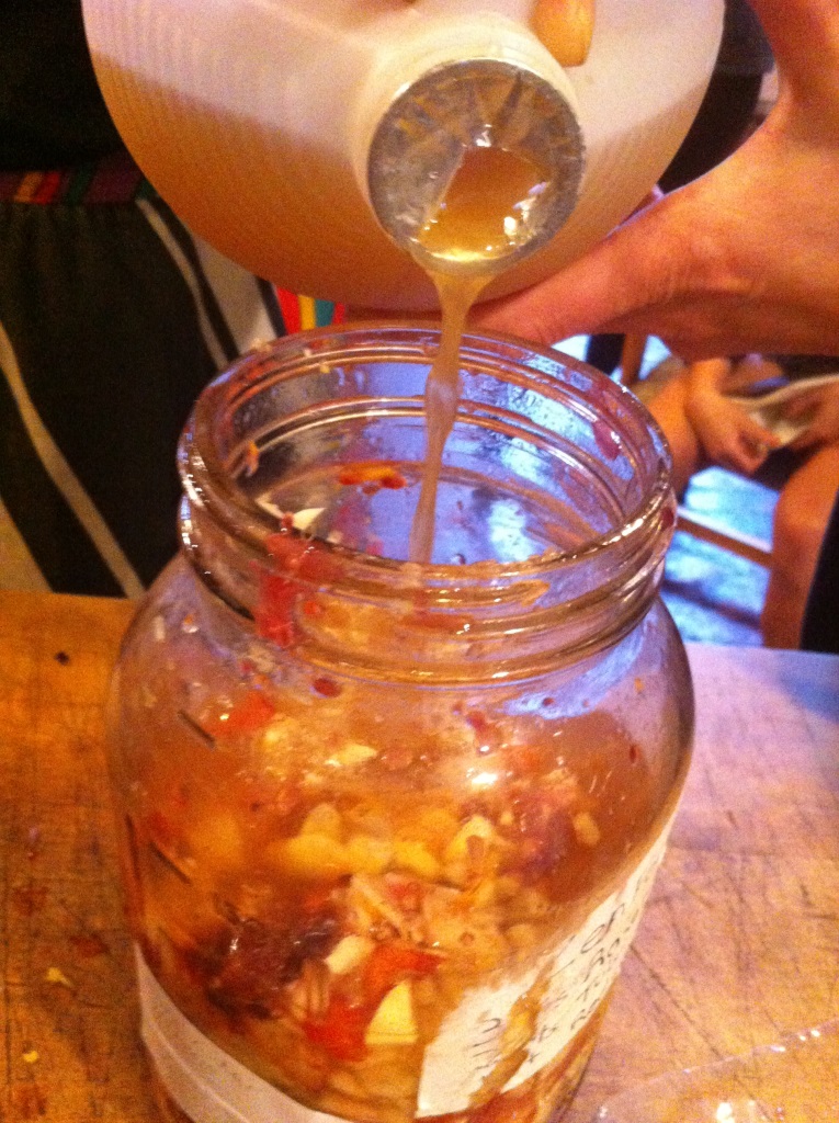 Mich fasziniert das farbenfrohe Gemisch, von dem ich in Deutschland noch nie gehört hatte. Als wir es nach drei Wochen abseihen und in ein kleines Fläschchen füllen ist es rosa geworden. Es schmeckt vorwiegend nach Knoblauch, ist feurig ohne schlimm scharf zu sein und gibt mir einen kleinen, geschmacklichen „Hallo-Wach-Kick“.