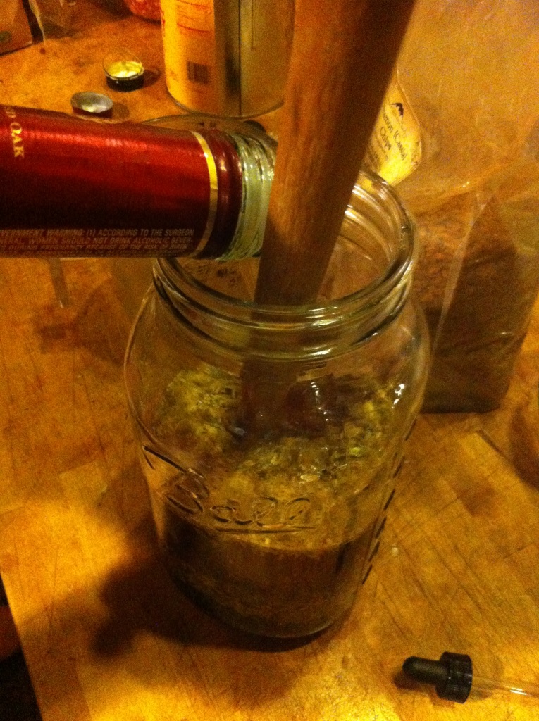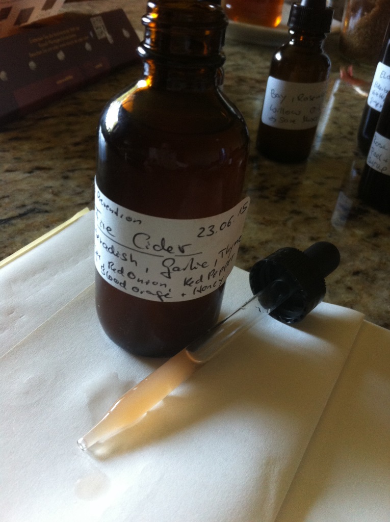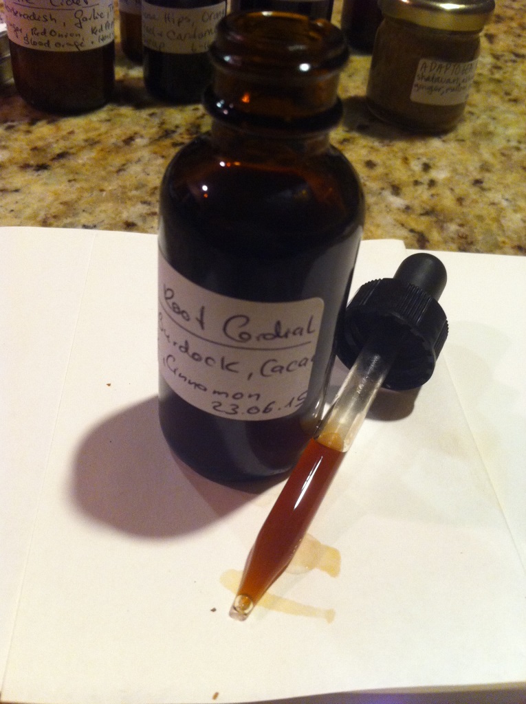 So ganz habe ich den Unterschied zwischen Elixier und Cordial nicht verstanden. Für unsere Lehrerin Liz sind die Begriffe austauschbar. Beides ist Alkohol und Honig mit Kräutern. Vielleicht ist ein Cordial etwas süßer, da es ursprünglich mit getrockneten Früchten gemacht wurde und ein Elixier ein wenig bitterer, weil man Kräuter und Wurzeln dafür verwendet. Sei es drum. Wir machen ein verdauungsförderndes Wurzel-Cordial (oder Elixier?).