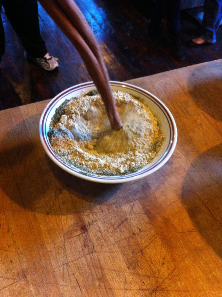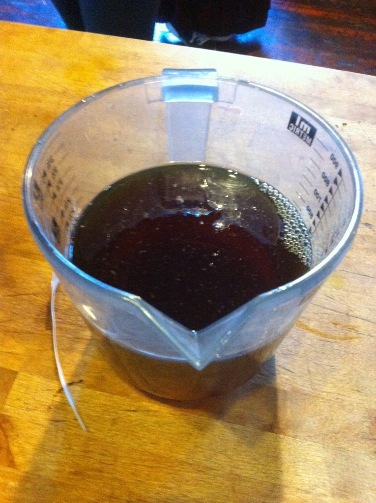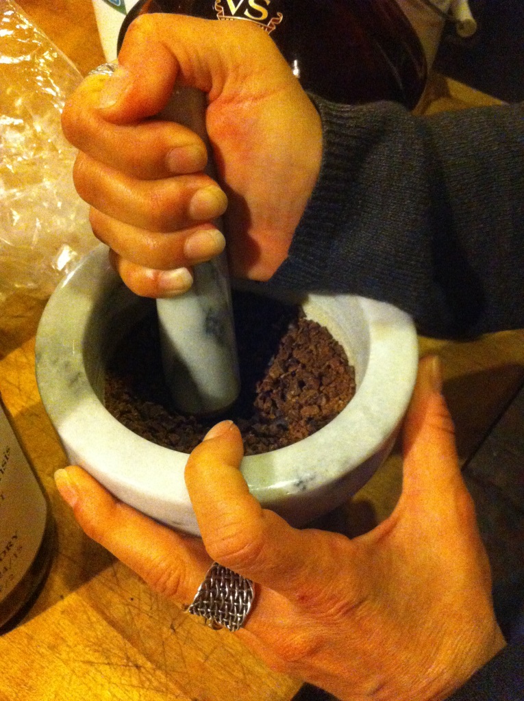 Wir zerkleinern die Kakao- und Wurzel-Stückchen im Mörser, um die Aromen zu entfesseln. Dazu gießen wir ordentlich Brandy und der Reifungsprozess unseres Gebräus kann beginnen. Nach drei Wochen (ein bis zwei Monate würden auch passen) seihen wir die Wurzelstückchen durch ein Tuch ab und erhalten eine bräunliche Flüssigkeit. Die messen wir ab und geben auf drei Tassen Kräuter-Brandy eine halbe Tasse Honig hinzu. Es schmeckt weihnachtlich nach Zimt-Brandy.