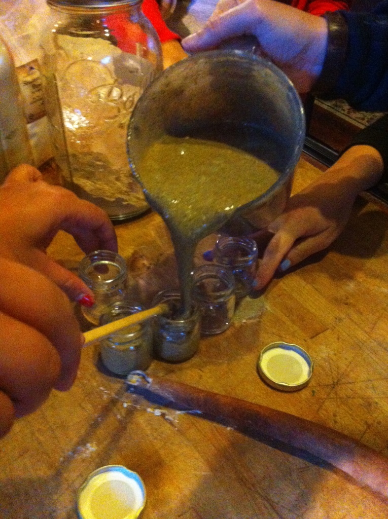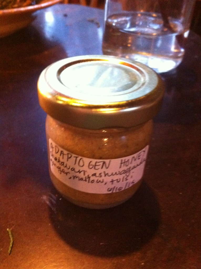 Während wir die Kräuter mit einem großen Zimtstab verrühren und in den Honig geben, erzählt uns eine Kursteilnehmerin von ihren Erfahrungen mit Ashwaganda. Als sie beruflich völlig überlastet war, hat ihr Ashwaganda innerhalb kurzer Zeit wieder Kraft und eine neue Perspektive gegeben. Hm. So werde ich natürlich neugierig und lecke an dem „Leckmittel“, das wir gerade in kleine Gläschen füllen.
