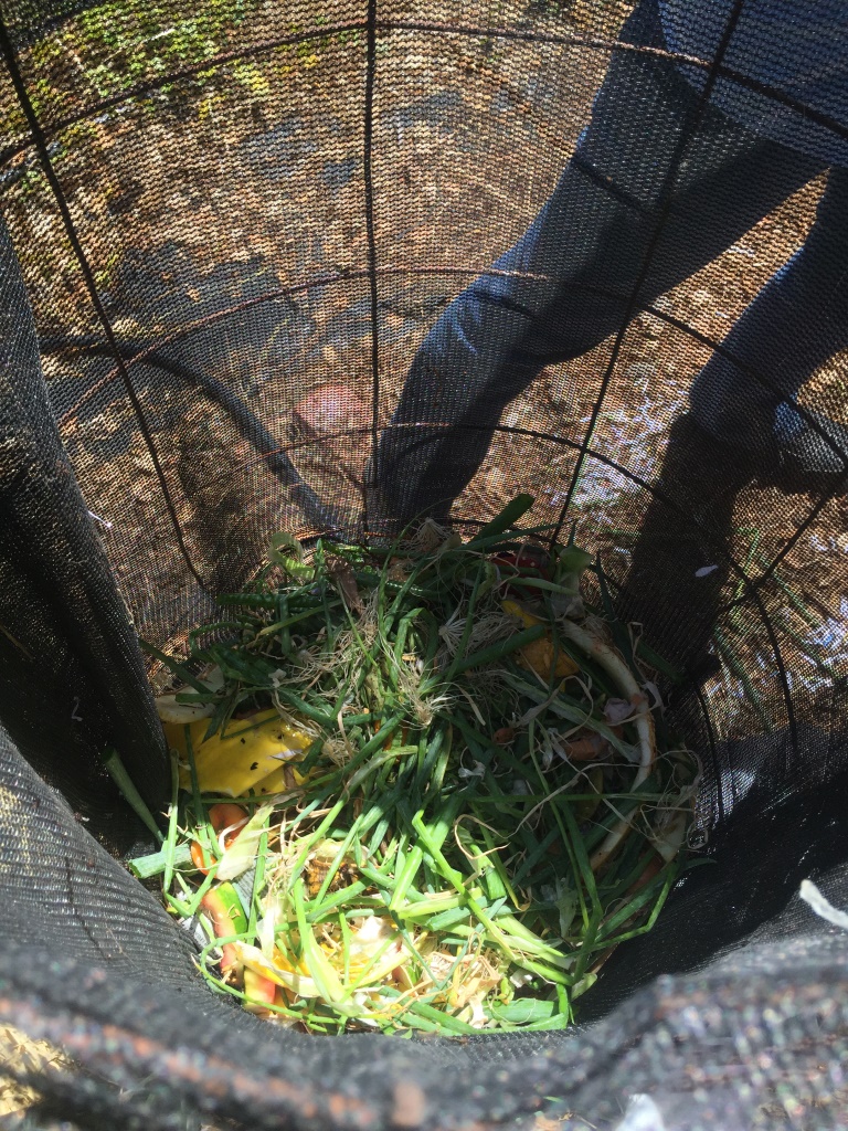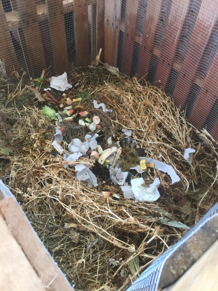 Schließlich steht das Meisterwerk doch und wir freuen uns aufs Befüllen mit den bereits gesammelten Gartenabfällen. Es ist ein schönes Gefühl, die viel bewässerten und gepflegten, aber wenig Erbsen tragenden Erbsen in guten Zauberhänden zu wissen. Es ist nicht mehr frustrierend, die misslungene, gelb-bittere Gurkenernte mit dem Hammer zu zermatschen und der Magie der Verrottung zu überlassen. Plötzlich macht es Spaß, Küchenabfälle wegzuschmeissen, völlig ohne schlechtes Gewissen. Wir sind die Guten, zumindest für einen klitzekleinen Moment.
