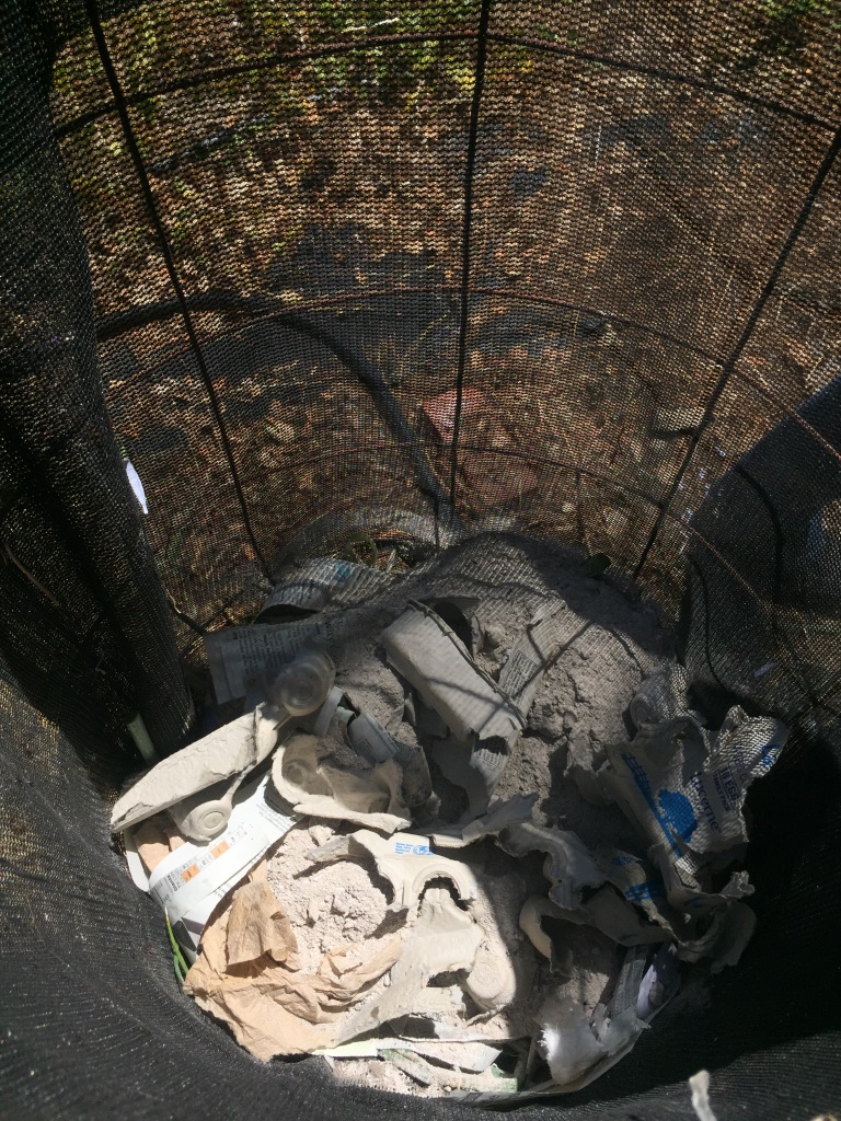 Die wohl einfachste, selbstgebaute Kompost-Variante steht schon bereit: Eisenstangen in den Boden, Hühnerzaun herumwickeln, mit Schattensegel ummanteln. Daneben liegen die Zutaten für unseren Abfallverwertungs-Hexenkessel: Küchenabfälle von Gemüseresten bis Kaffeesatz und Eierschalen, Asche aus dem Holzofen, Gartenabfälle von Laub bis Rasenschnitt, Karton und Zeitungspapier.