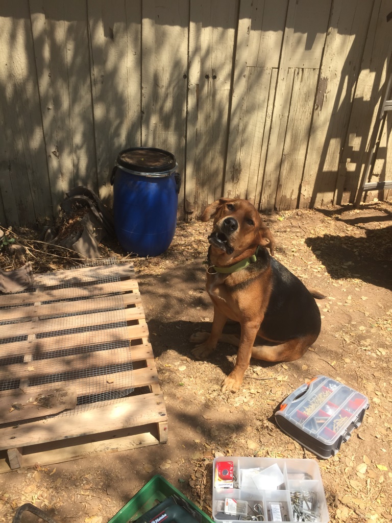 Unser Hund beäugt das Tun etwas skeptisch, schließlich sieht er uns Schrauben schräg ansetzen, U-Nägel wutentbrannt schief reinhauen und die Wasserwaage verfluchen. Wer hätte gedacht, dass Holzpaletten so hart sein können.