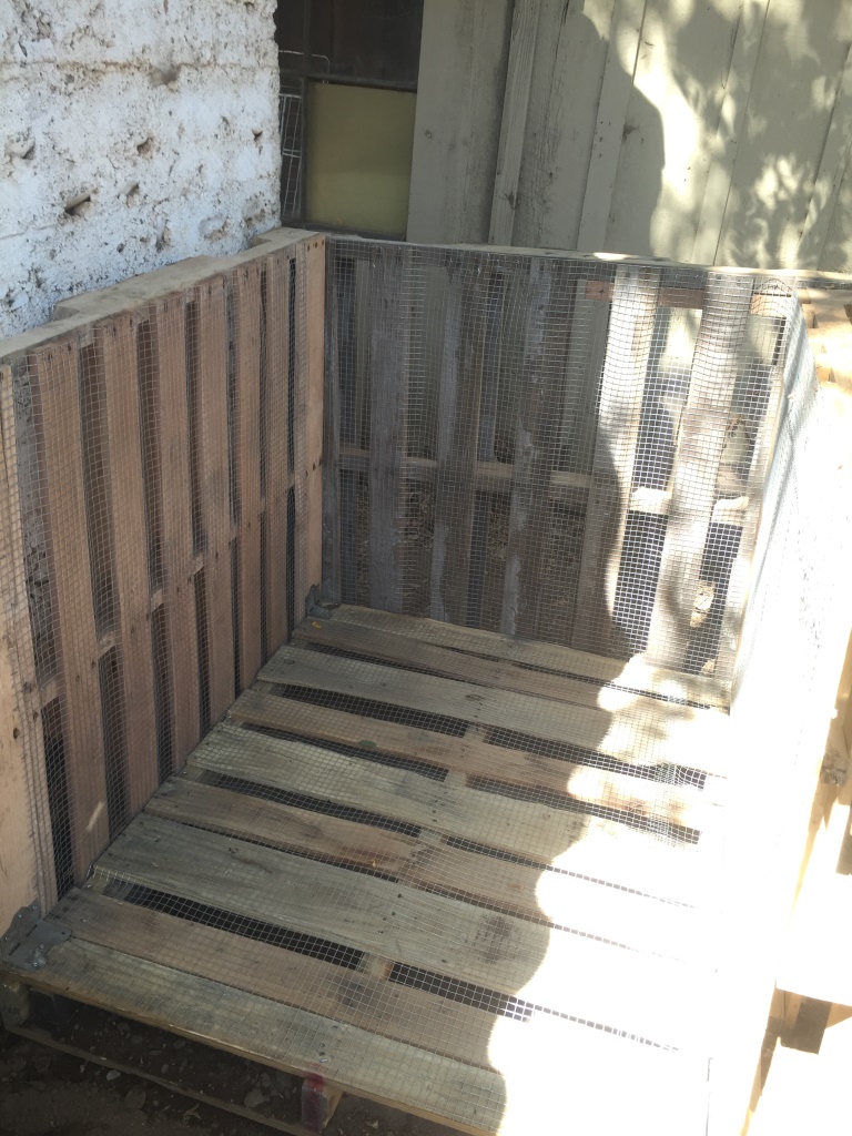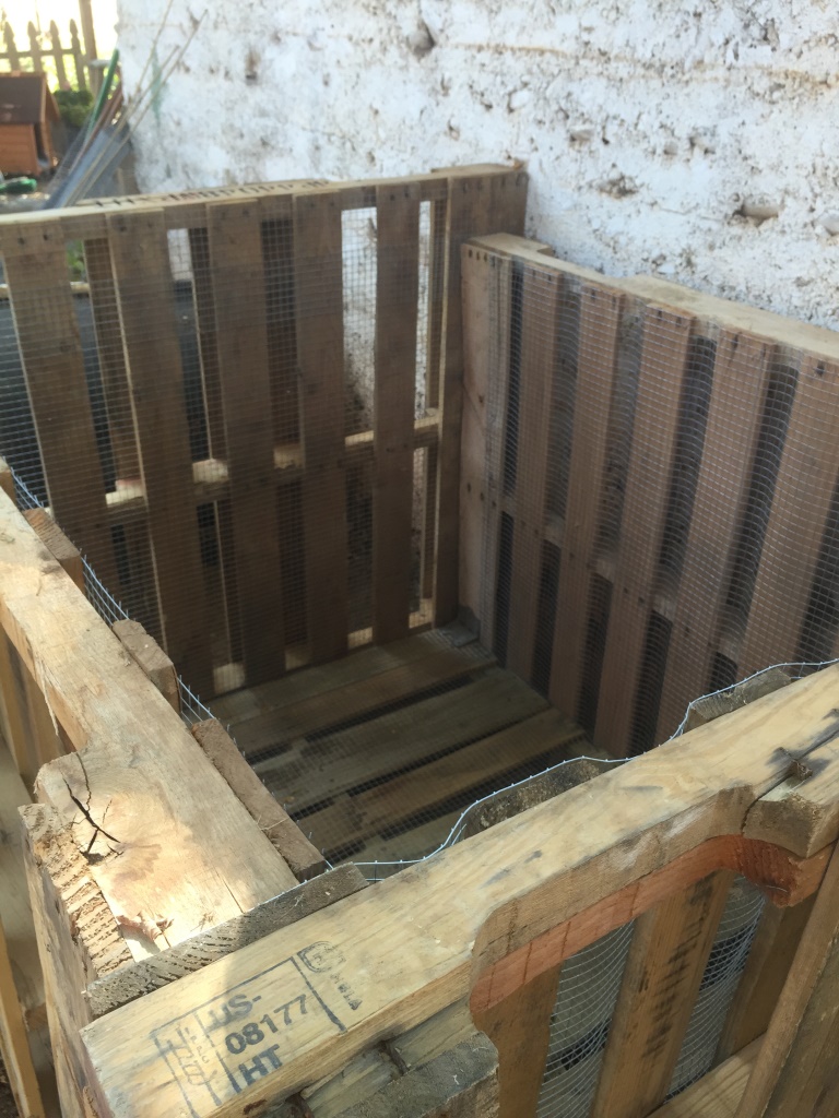 Wir wissen nun wenig genug, um uns unbedarft ans Werk zu wagen. Im Baumarkt fragen wir nach gebrauchten Holzpaletten und bekommen prompt sechs Stück geschenkt. Die Paletten betackern wir mit engem Maschendraht, damit keine Tiere hinein und keine Pflanzenreste herraus kommen.