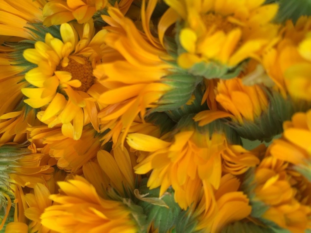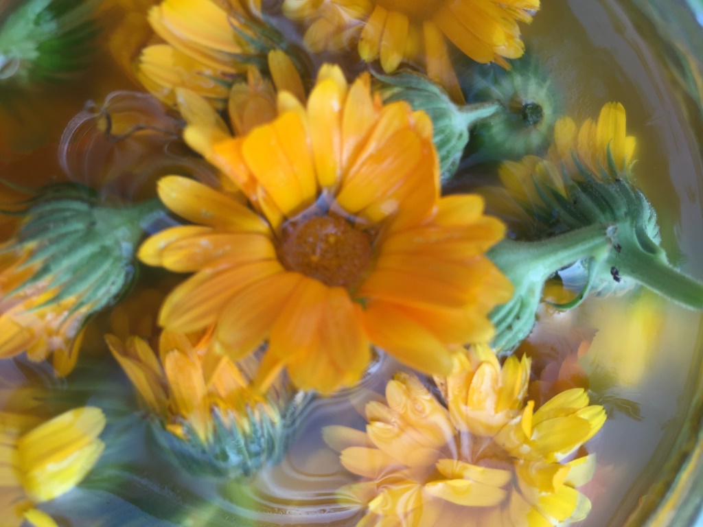 Im Gegenteil: Zuerst haben Kamille und Ringelblume die Bienen im Garten glücklich gemacht und uns ihren schönen Anblick geschenkt. Der Duft der Kamille nach lieblicher Mandel und Unschuld hat uns in die geborgenen Momente der Kindheit zurückversetzt. Die weichen Blütenblätter der Ringelblume und ihr klebriger Harz haben uns daran erinnert, das Sanftheit und Stärke zusammen gehören.