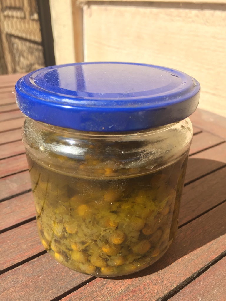 Die Sonnenstrahlen helfen dem Traubenkernöl, alle guten Inhaltsstoffe der Blüten aufzunehmen. Nach einiger Zeit sieht man schon die Verwandlung. Das ursprünglich weißwein-farbene Öl wird durch die Kamillenblüten grünlich und duftet nach Kamille. Die Ringelblumenblüten färben das Öl orange und geben ihm einen herberen Duft.