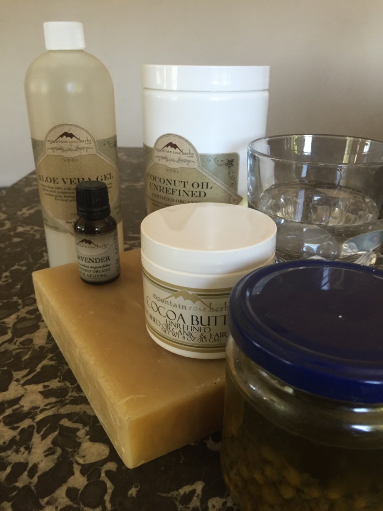 Wir bekommen ein sehr grünes Kamillenöl-Gemisch und ein orangenes Ringelblumen-Gemisch. Dazu stellen wir die jeweils noch fehlenden Zutaten:  Destilliertes Wasser, Aloe Vera Gel und Ätherisches Lavendel-Öl.