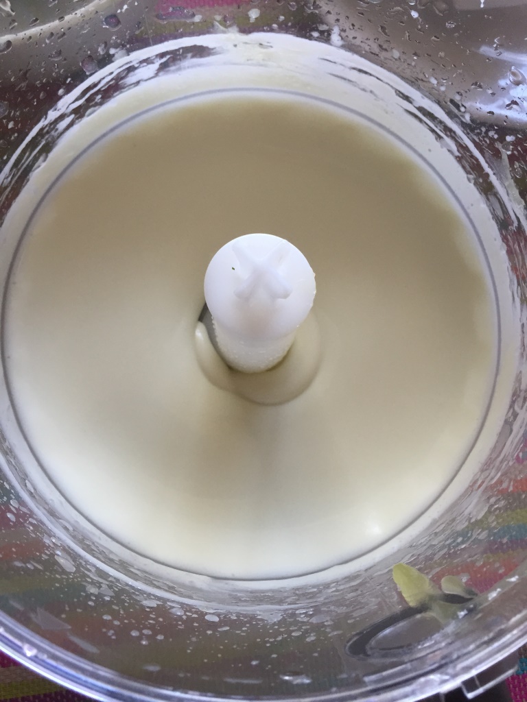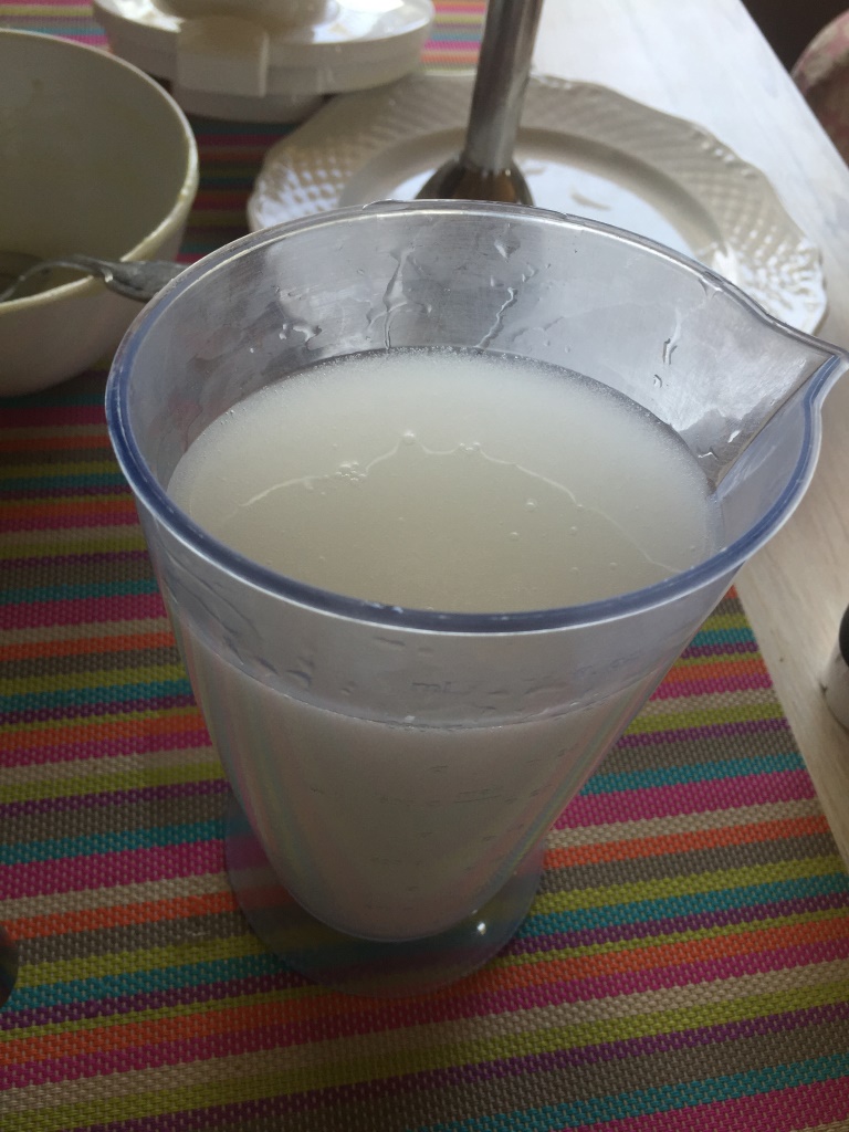 Jetzt haben wir aus allen Zutaten ein kamillenölhaltiges Gemisch, ein ringelblumenölhaltiges Gemisch und jeweils dazu ein wasserhaltiges Gemisch gebraut. Wir geben das kamillenölhaltige Gemisch in den Mixer, schütten das wasserhaltige Gemisch langsam dazu und bekommen eine feine Kamillen-Sahne-Creme als Ergebnis.
