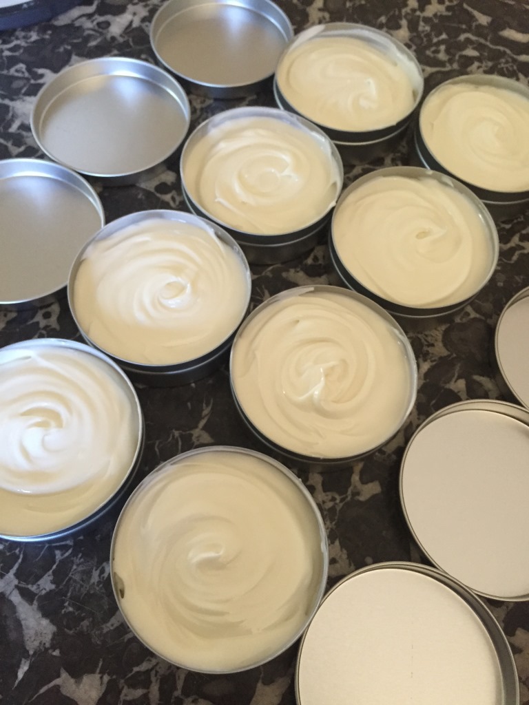 Das Gleiche wiederholen wir mit dem ringelblumenölhaltigen Gemisch und bekommen eine Ringelblumen-Sahne-Creme als Ergebnis. Beide Cremes sehen identisch aus, riechen aber einmal (stark) nach Kamille und einmal (leicht) nach Ringelblumen. Jetzt können wir in Döschen abfüllen und testen.